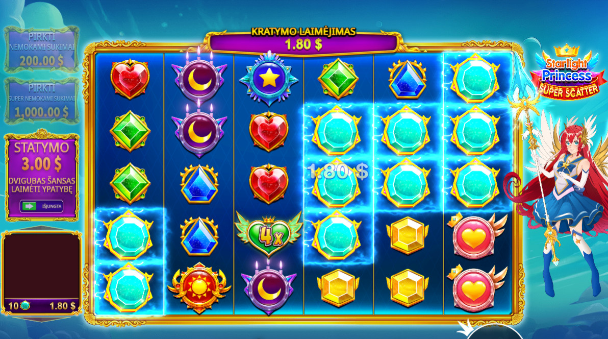 Kaip ir „Gates of Olympus“, šis žaidimas pasižymi įspūdinga dinamika – tik Dzeuso vietą užima magiška princesė, o atsitiktiniai daugikliai gali pakelti laimėjimus net iki 50 000x.