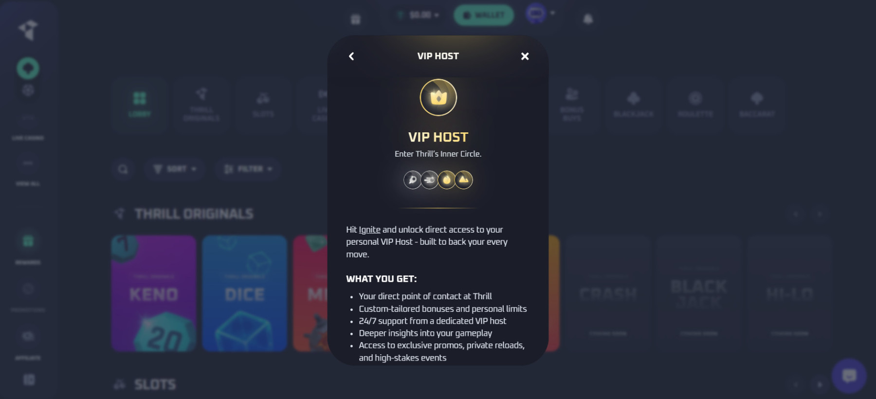 Norint gauti savo asmeninį konsultantą, pirmiausia reikia pasiekti „Ignite“ lygį. Tuomet su jumis tiesiogiai susisieks „Thrill“ klientų aptarnavimo specialistas ir padės susikurti VIP paskyrą.