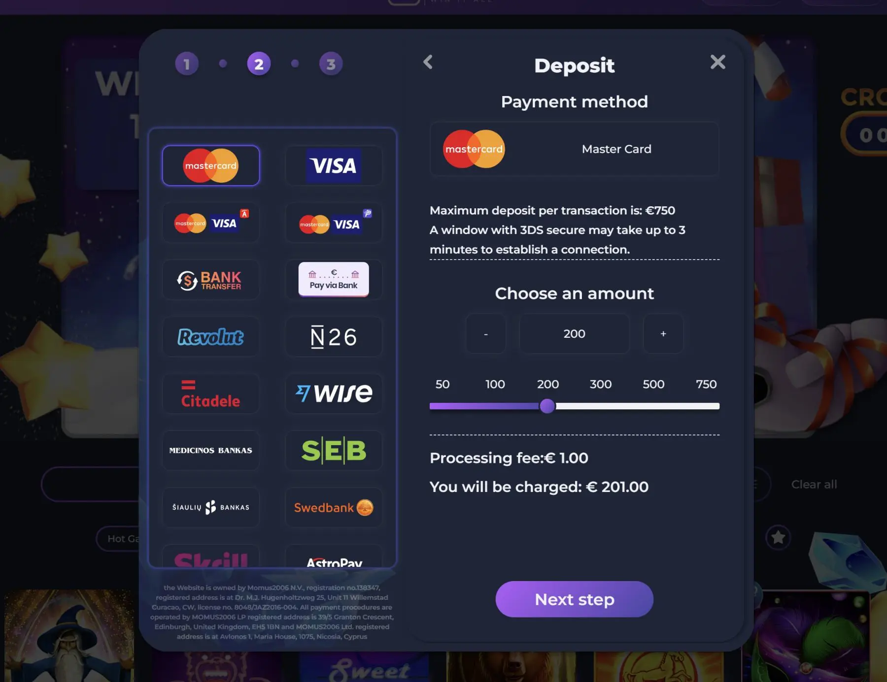 Minimali įmokos suma šioje bendrovėje įprastai yra 10€ arba 20€, priklausomai nuo pasirinkto mokėjimo metodai, Norėtume paminėti, kad patogiausias būdas, atlikti mokėjimus yra naudojant kriptovaliutas. Taip Jūsų pinigai greičiausiai pasieks Jūsų sąskaitą, o taip pat, galėsite gauti didžiausią premiją.