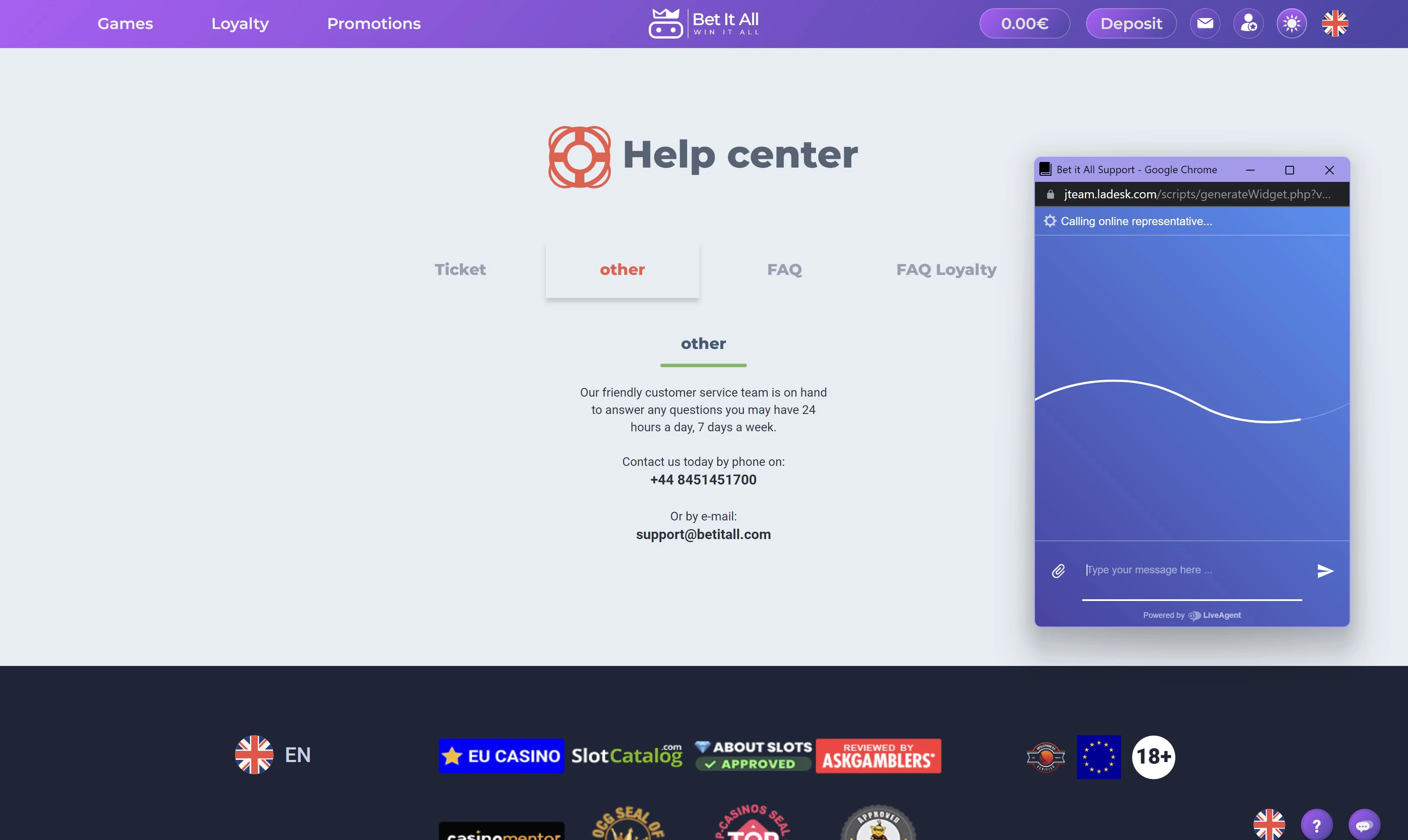 Žaidžiant užsienietiškame kazino labai svarbu, kad jis turėtų gerai veikiantį klientų aptarnavimo centrą ir BetItAll tokį tikrai turi. Pagalbą šiame kazino galėsite gauti naudodami tiesioginio pokalbio funkciją, kuri veikia visos paros metu.
