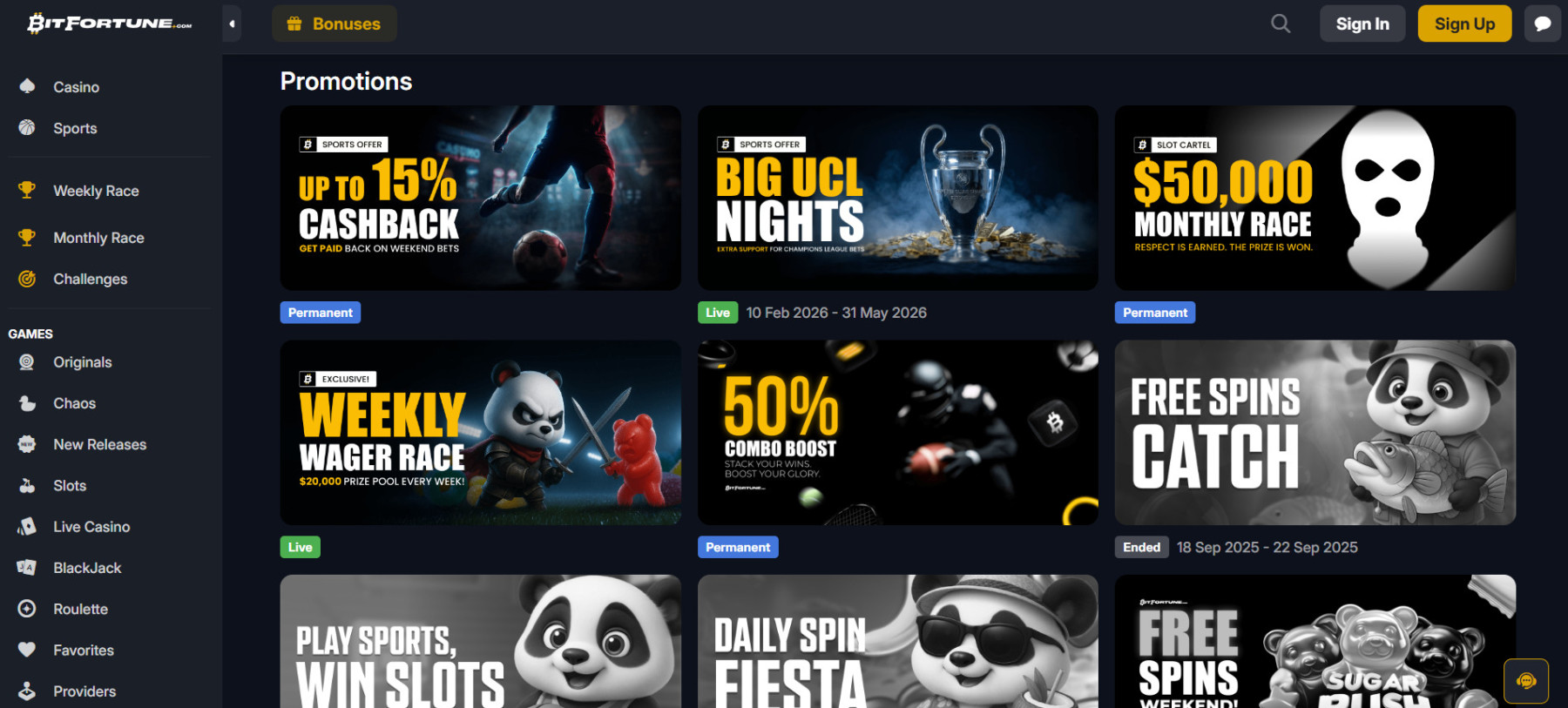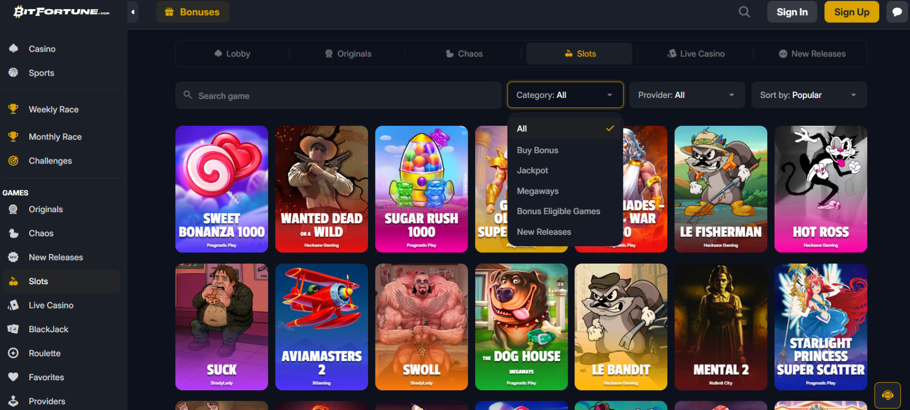 „BitFortune“ lošimo automatų skiltis maloniai nustebino savo įvairove. Čia bendradarbiaujama net su 28 gerai žinomais tiekėjais, tarp jų – „NetEnt“ ir „Pragmatic Play“.