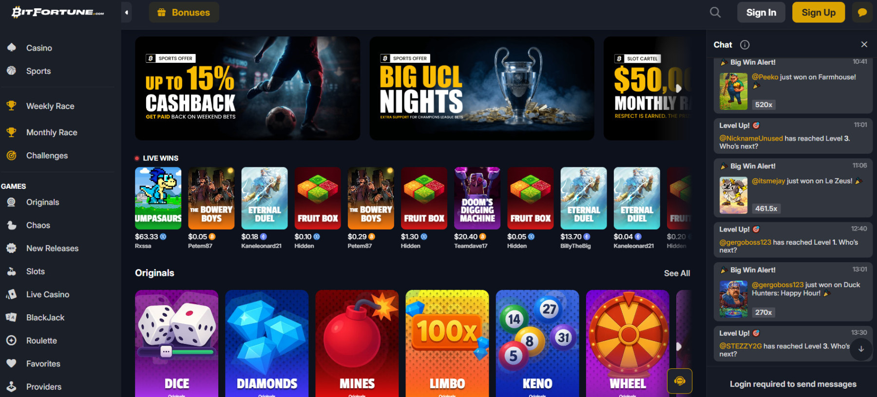 Pamatę, jog „BitFortune“ turi savų žaidimų, iškart susidomėjome. Išbandėme „Originals“ kategoriją ir tokius žaidimus kaip „Dragon’s Tower“, „Mines“ bei „Slider“. Šie žaidimai mus iškart sužavėjo savo paprastumu ir galimybe patiems kontroliuoti riziką – pavyzdžiui, žaisdami „Mines“, jūs patys sprendžiate, kada sustoti ir atsiimti laimėjimą.