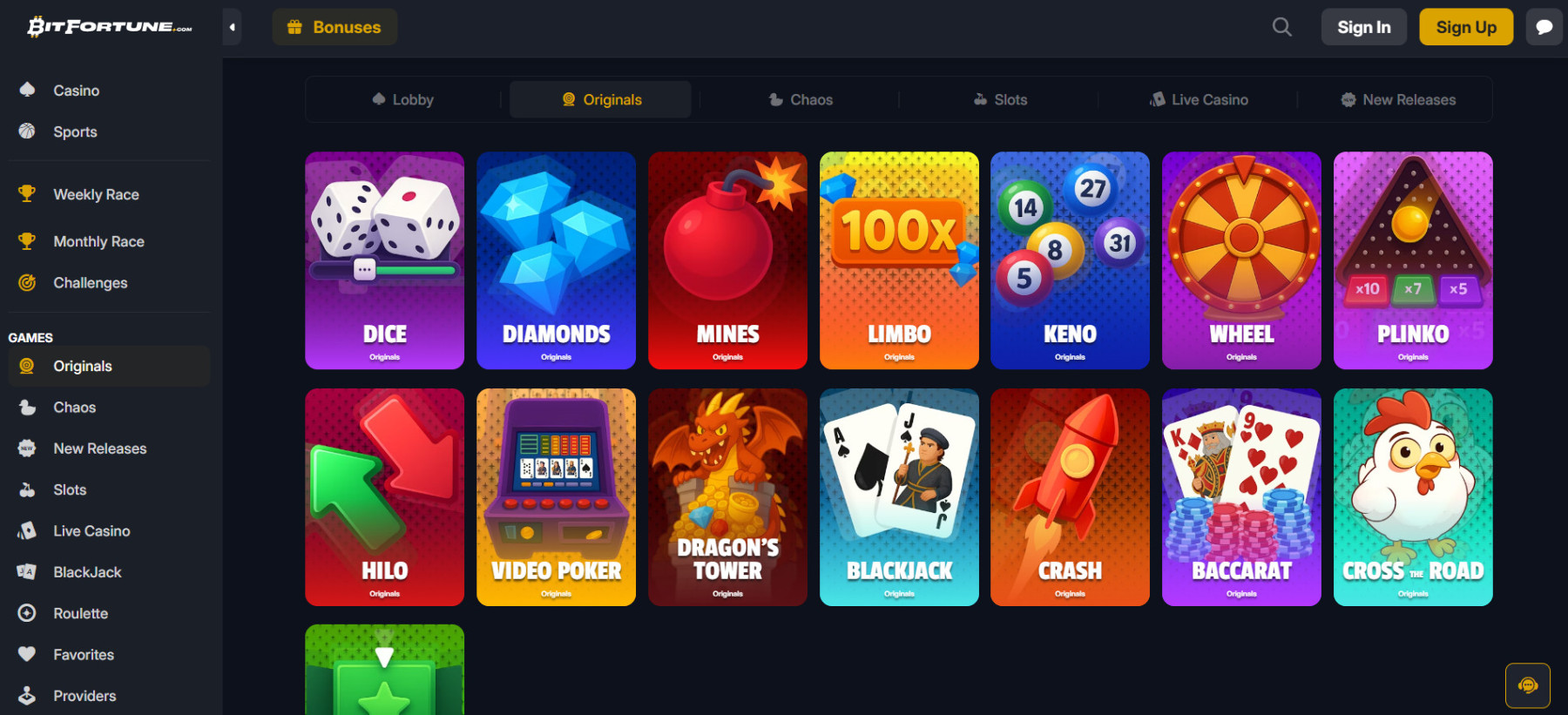„BitFortune“ kazino siūlo platų pasirinkimą: lošimo automatus, stalo žaidimus su gyvais dalintojais bei unikalius originalius žaidimus, tokius kaip „Crash“ ar „Plinko“.