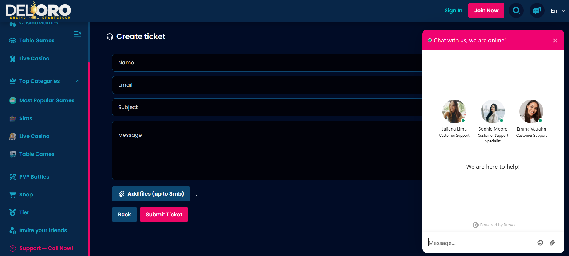 Vertindami klientų aptarnavimą, „DelOro“ išbandėme tiek gyvą pokalbį, tiek el. pašto sistemą, tiek užklausų kūrimo (ticket) formą. Bendra patirtis buvo pozityvi – pagalba prieinama visą parą, o atsakymų kokybė atitinka tai, ko tikėtumės iš tarptautinio kazino.