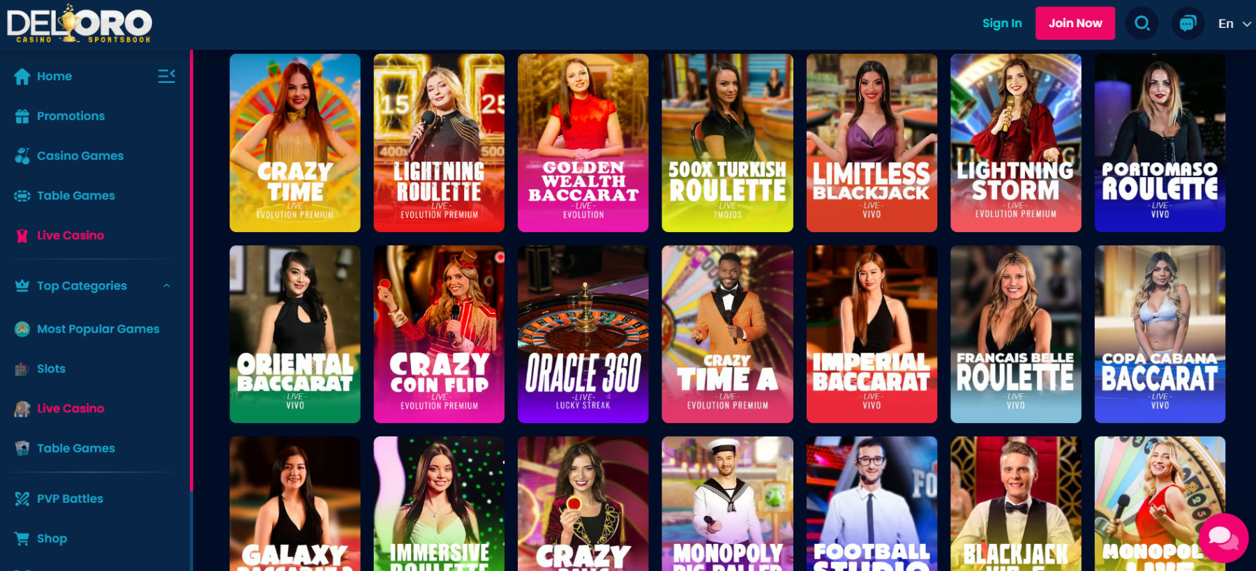 Jeigu mėgstate gyvus šou, „DelOro“ tam turi puikias sąlygas – čia rasite tokius populiarius žaidimus kaip „Crazy Time“, „Lightning Roulette“, „Golden Wealth Baccarat“, „Crazy Coin Flip“, „Immersive Roulette“, „Portomaso Roulette“ ir „Limitless Blackjack“.