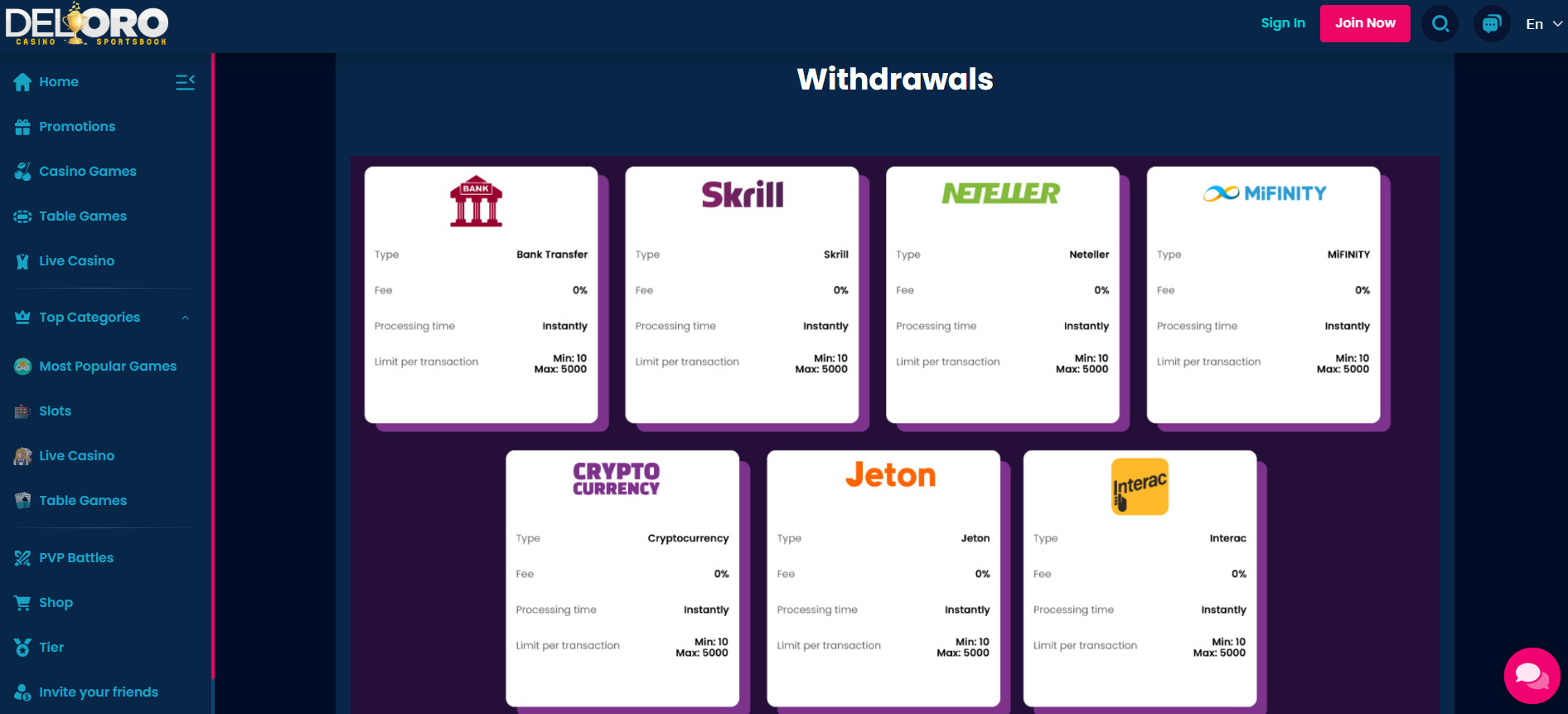 Analizuodami „DelOro“ mokėjimų sistemą, pirmiausia įvertinome, ar atsiskaitymo procesas čia aiškus, greitas ir pakankamai lankstus skirtingų šalių žaidėjams. „DelOro“ tikrai nenusileidžia didiesiems rinkos kazino – platforma palaiko daugiau nei 25 skirtingas valiutas ir turi platų atsiskaitymo būdų pasirinkimą.