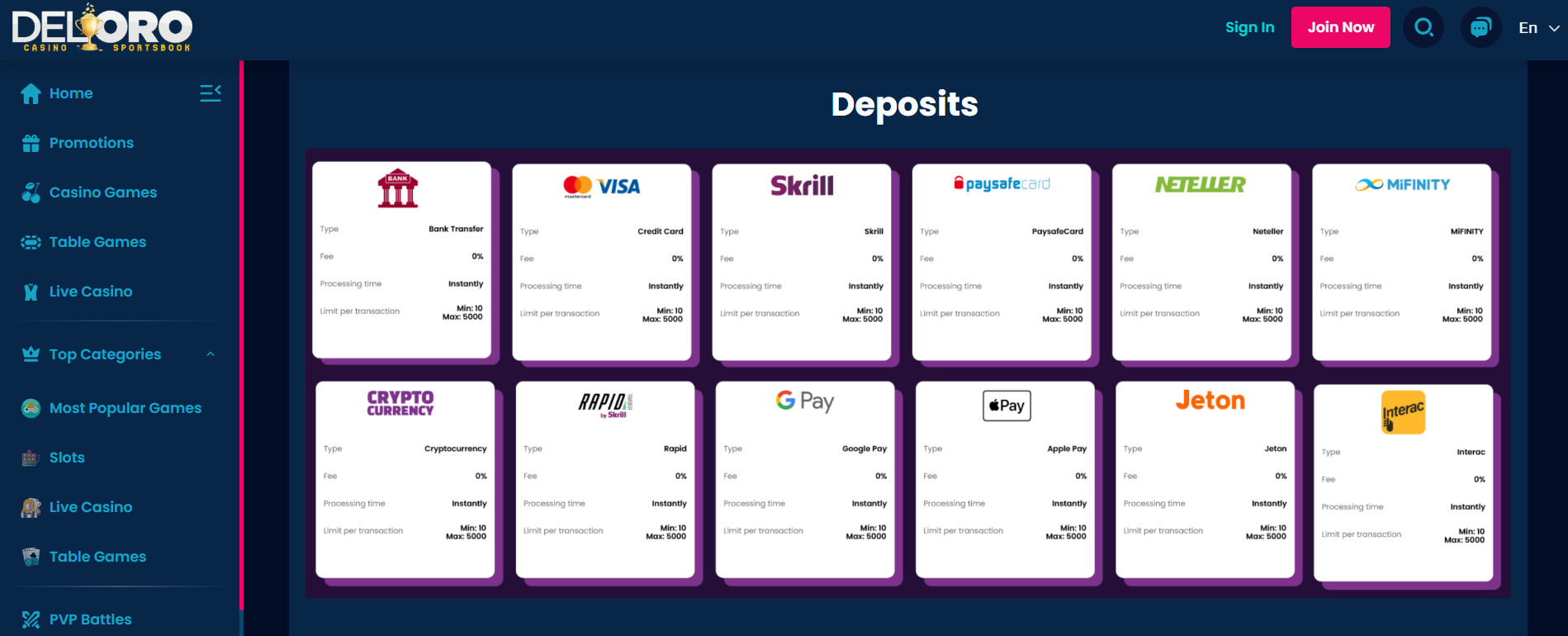 „DelOro“ leidžia įnešti pinigus tiek tradiciniais bankiniais metodais, tiek elektroninėmis piniginėmis, tiek kriptovaliutomis. Mažiausia suma visiems metodams vienoda – nuo 10 €, o maksimali gali siekti 5000 € per operaciją.