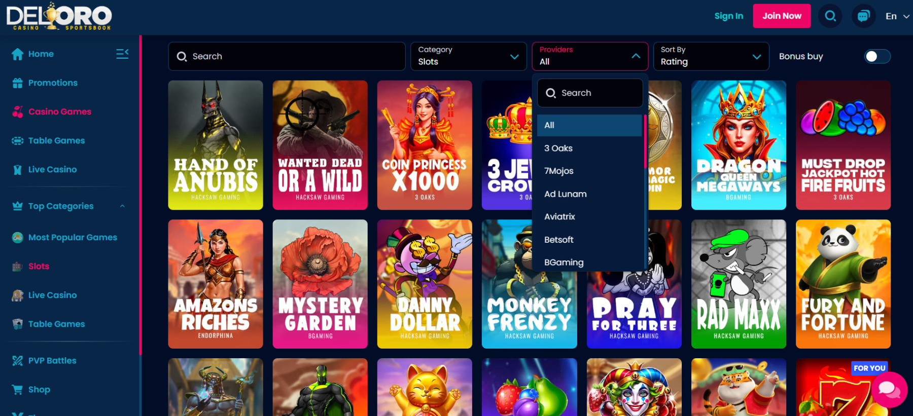 Lošimų automatų skyrius yra didžiausia, virš 3 000 žaidimų, „DelOro“ sekcija, ir čia tikrai turėjome, ką analizuoti. Įspūdis labai geras – žaidimai suskirstyti pagal populiarumą, tiekėjus, temas, specialius režimus (pvz., Bonus Buy), o filtrai veikia greitai ir tiksliai.