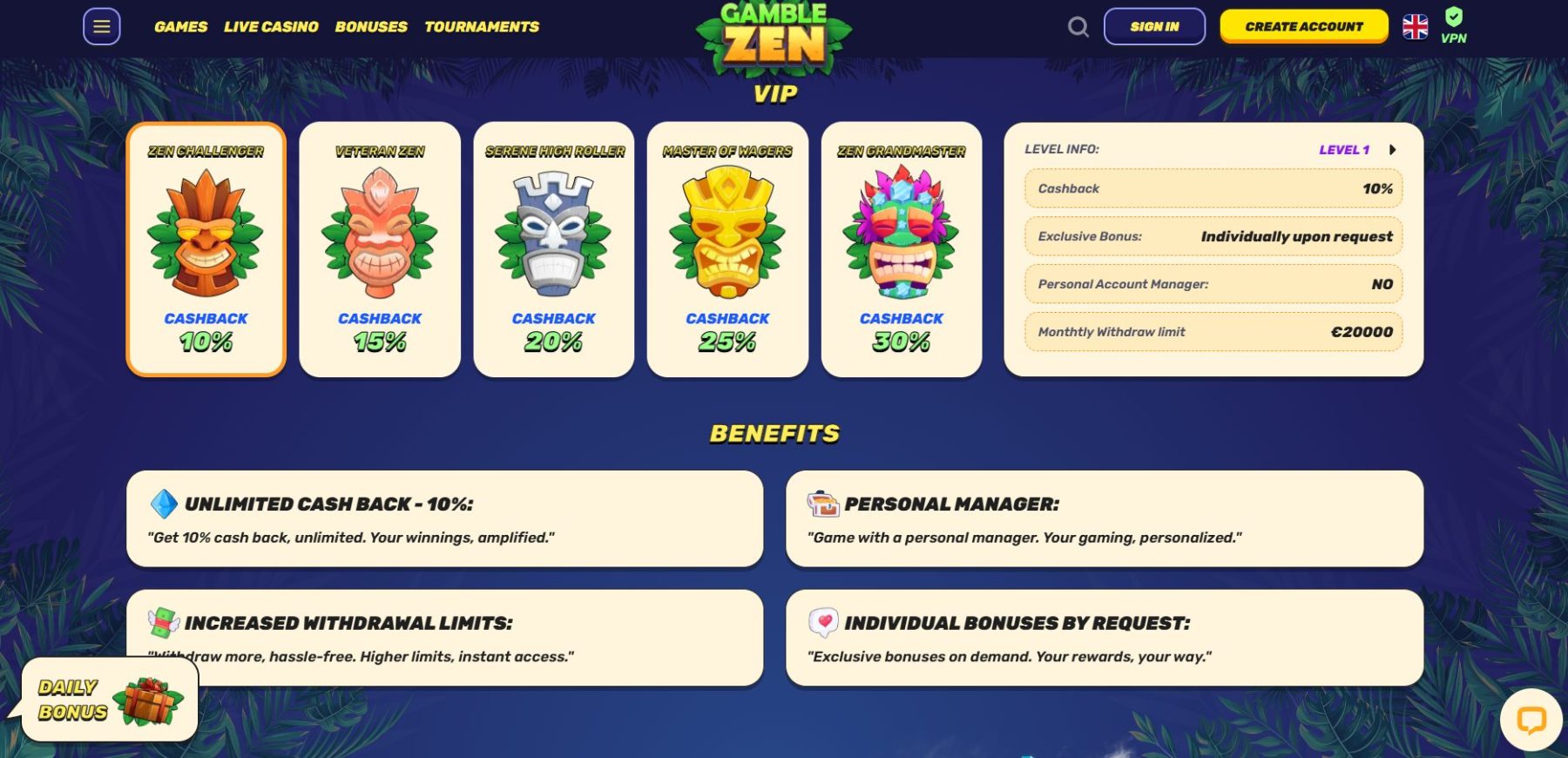 Jei norite daugiau privilegijų ir žaisti be jokių suvaržymų, „Gamblezen“ kazino VIP programa skirta kaip tik jums. Kiekvienas naujas lygis suteikia vis naujų galimybių, kurios palengvina tiek žaidimą, tiek laimėjimų gavimą.