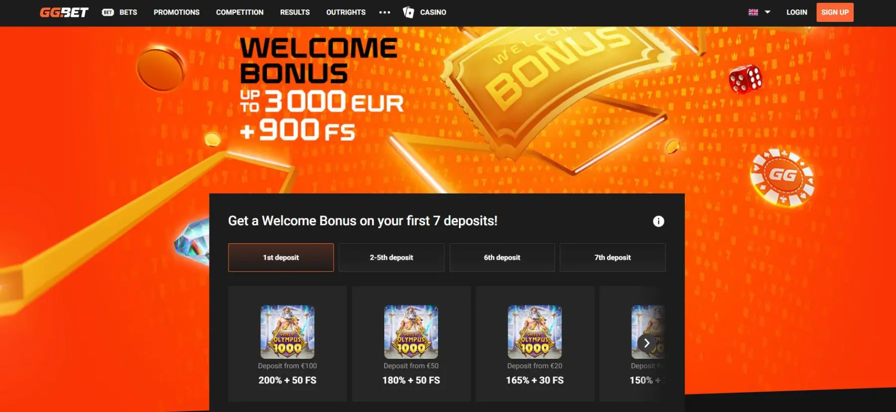 „GG.Bet“ siūlo pasveikinimo premiją, kuri galioja net septyniems pirmiesiems įnašams – tai daugiau nei įprasta daugelyje kazino. Jei planuojate žaisti aktyviai, tai puiki proga pasiimti visą premijų paketą – 3000 € ir 900 nemokamų sukimų.