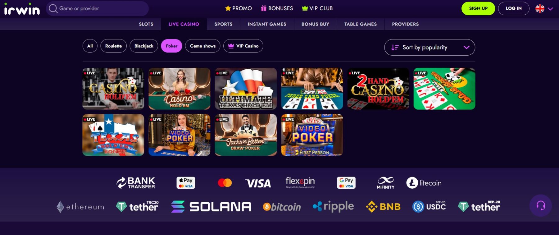Jei esate žaidę pokerį, tikriausiai „Texas Hold’em“ variantą pažįstate geriausiai. „Irwin“ galite prisijungti prie virtualaus stalo ir varžytis su tikrais žaidėjais, o ne su kazino.