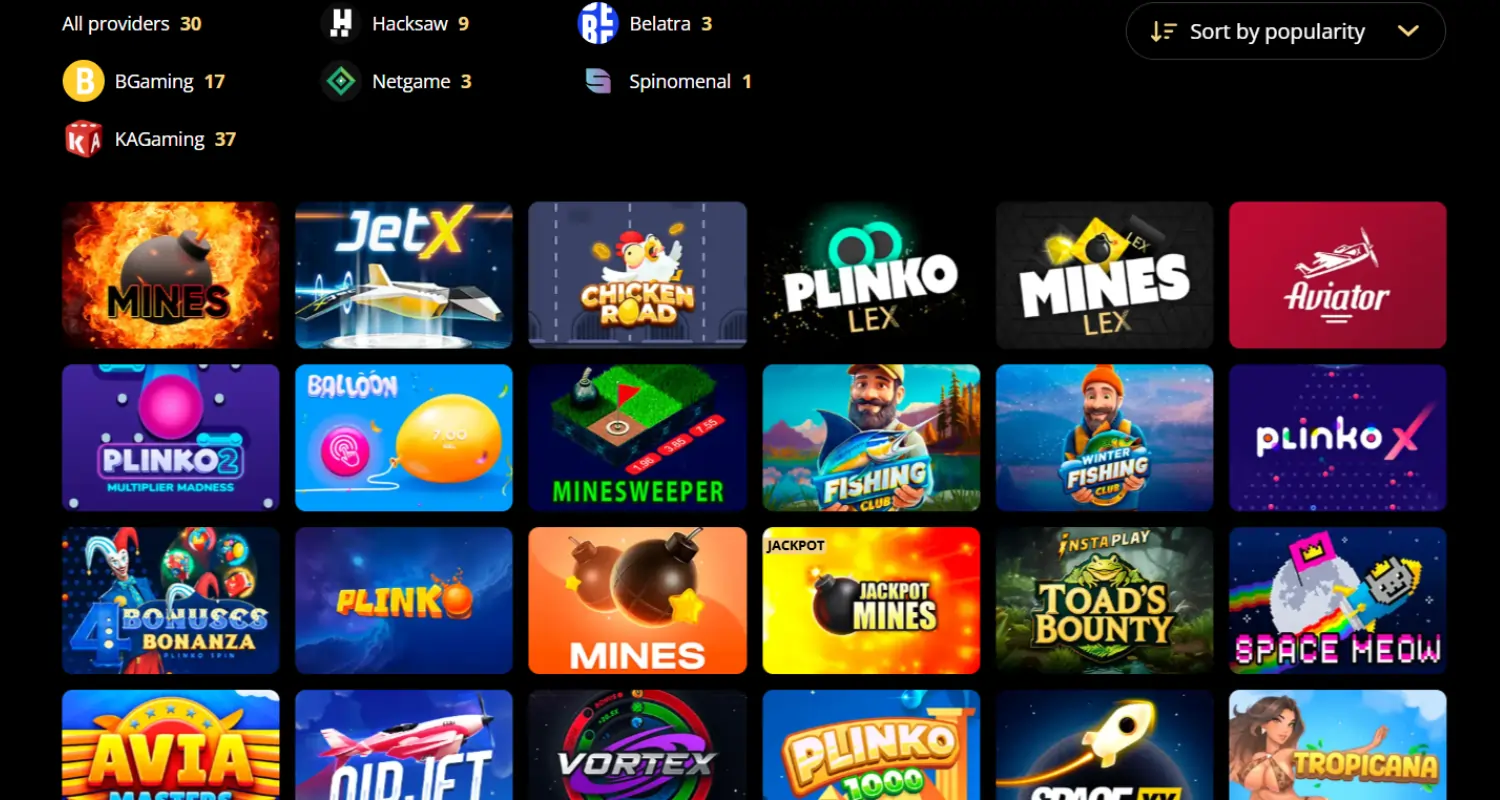 „Lex“ siūlo ir „Instant Games“ – greito veiksmo žaidimus iš daugiau nei 200 tiekėjų, tarp jų: „BGaming“, „KAGaming“, „Netgame“, „Hacksaw“ ir kt.