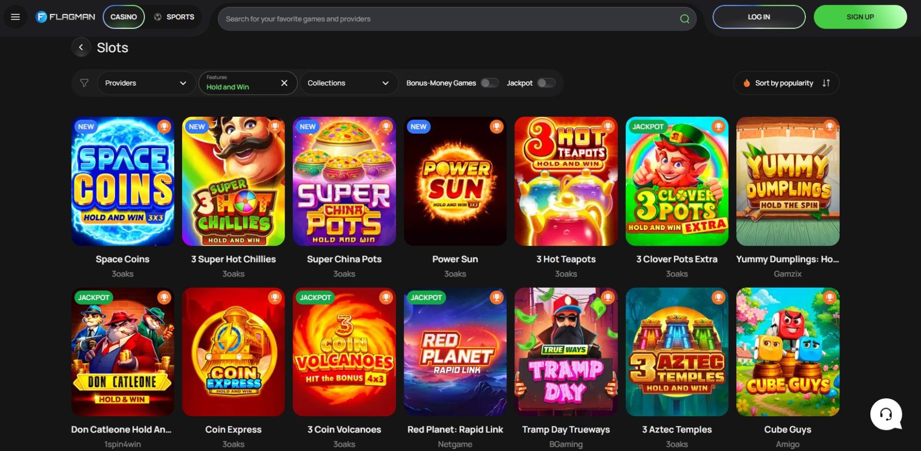 „Flagman“ kazino siūlo kruopščiai atrinktą „Hold & Win“ lošimo automatų pasirinkimą su patikimais tiekėjais, sąžiningais RTP rodikliais ir sklandžia žaidimų eiga.