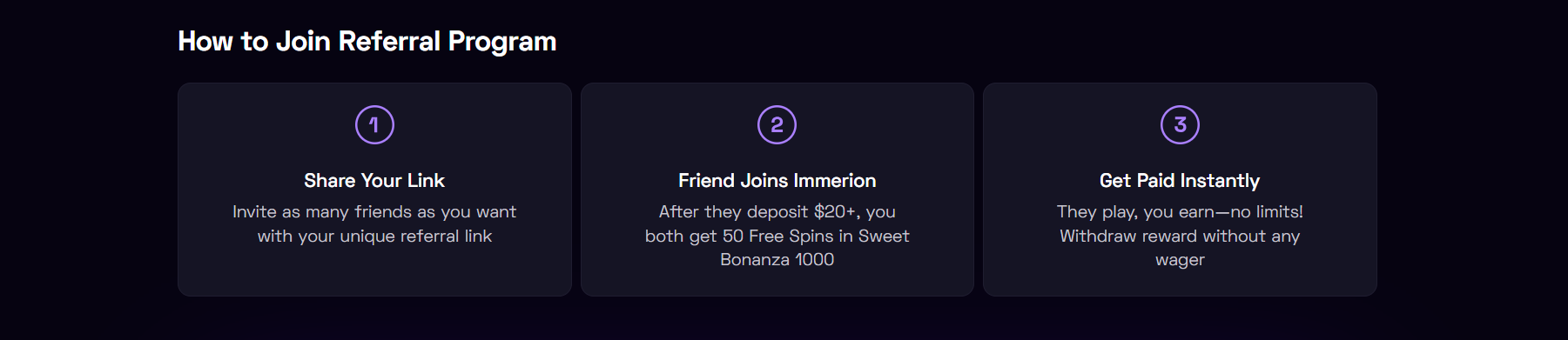 - Kai jūsų draugas prisijungs prie „Immerion“ ir atliks pirmąjį 20 USD ar didesnį įnašą, abu gausite 50 nemokamų sukimų populiariu lošimo automatu „Sweet Bonanza 1000“ kaip pasveikinimo premiją.