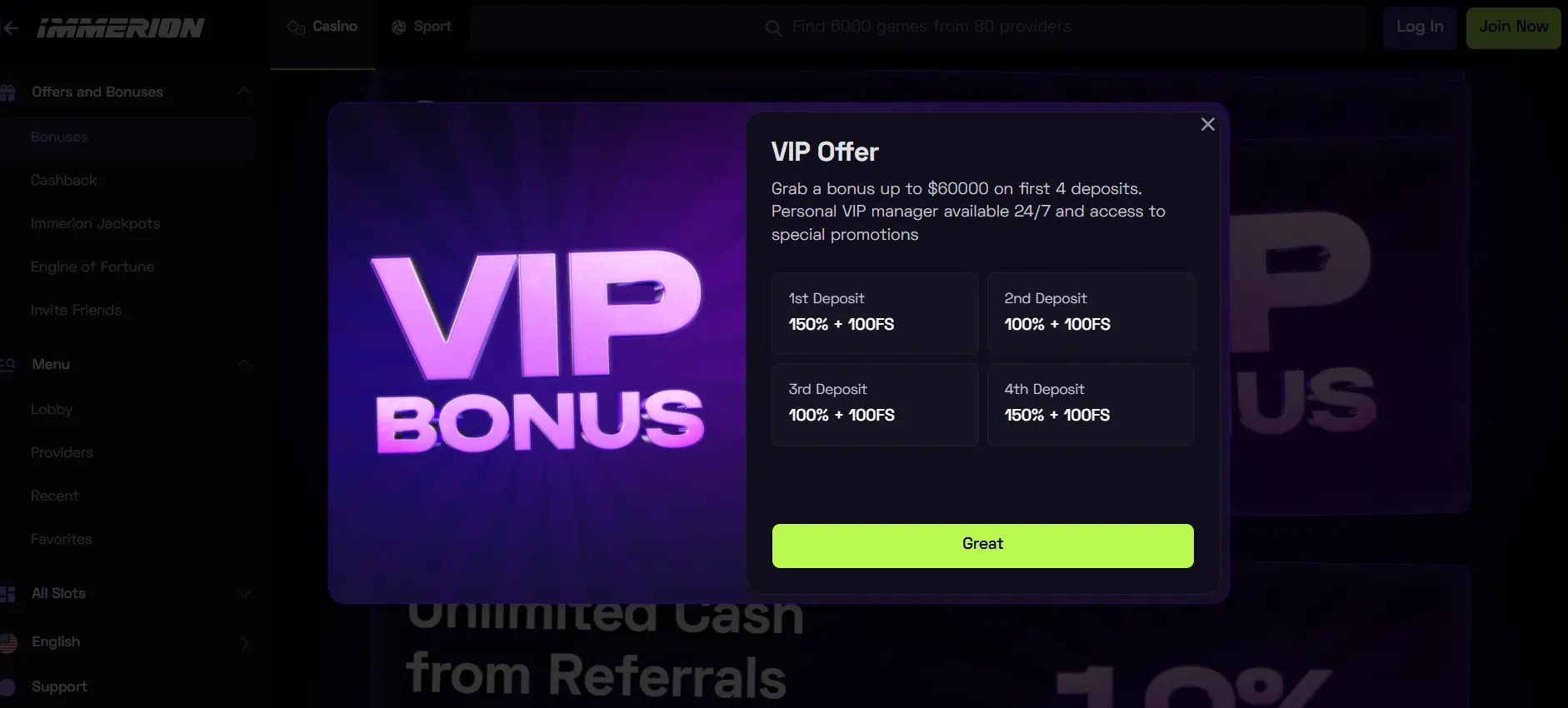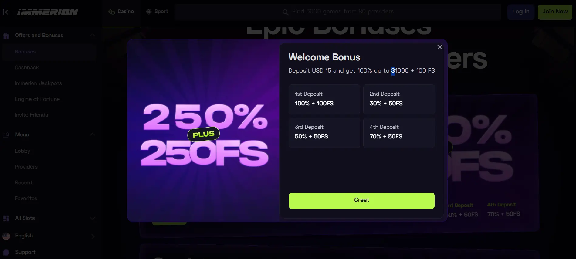 - Naujokams „Immerion“ kazino siūlo pasveikinimo paketą su 250 % premijų ir 250 nemokamų sukimų.