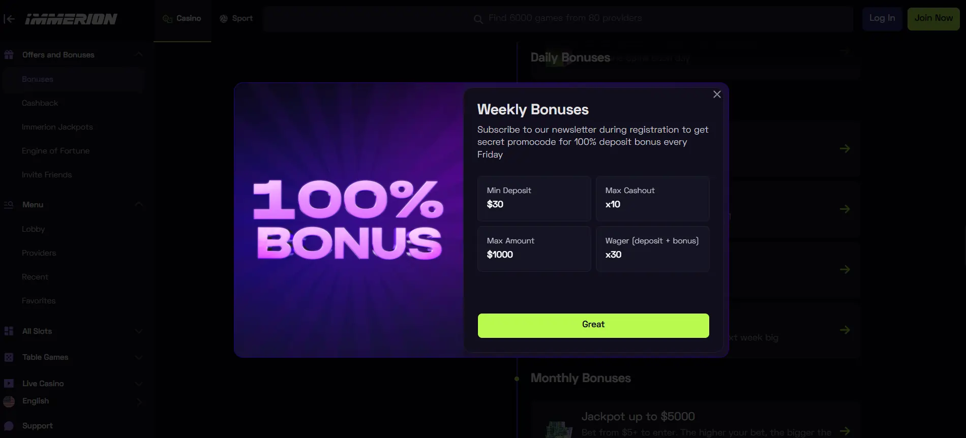 Mūsų komanda pastebėjo ypatingą būdą, kaip savaitgalį „Immerion“ kazino pradėti sėkmingai. Viskas labai paprasta – registruodamiesi prenumeruokite „Immerion“ naujienlaiškį ir kiekvieną penktadienį gaukite slaptą „promo“ kodą 100 % įmokos premijai.