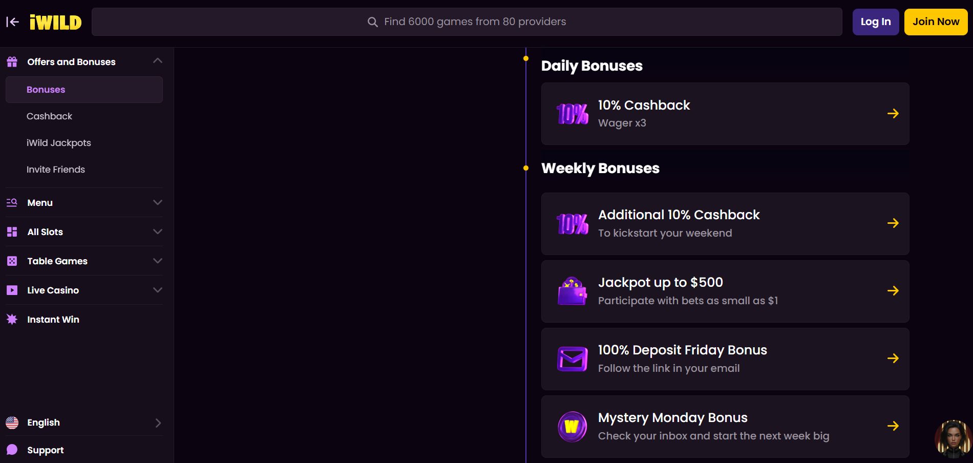 „iWild“ internetinis kazino nestokoja bonusų. Vos prisijungus laukia dosni kazino pasveikinimo premija, tačiau tuo viskas nesibaigia. Čia rasite pinigų grąžą (cashback), pakartotinius pasiūlymus (reloads), jackpotus ir net rekomendacijų (referral) programas.