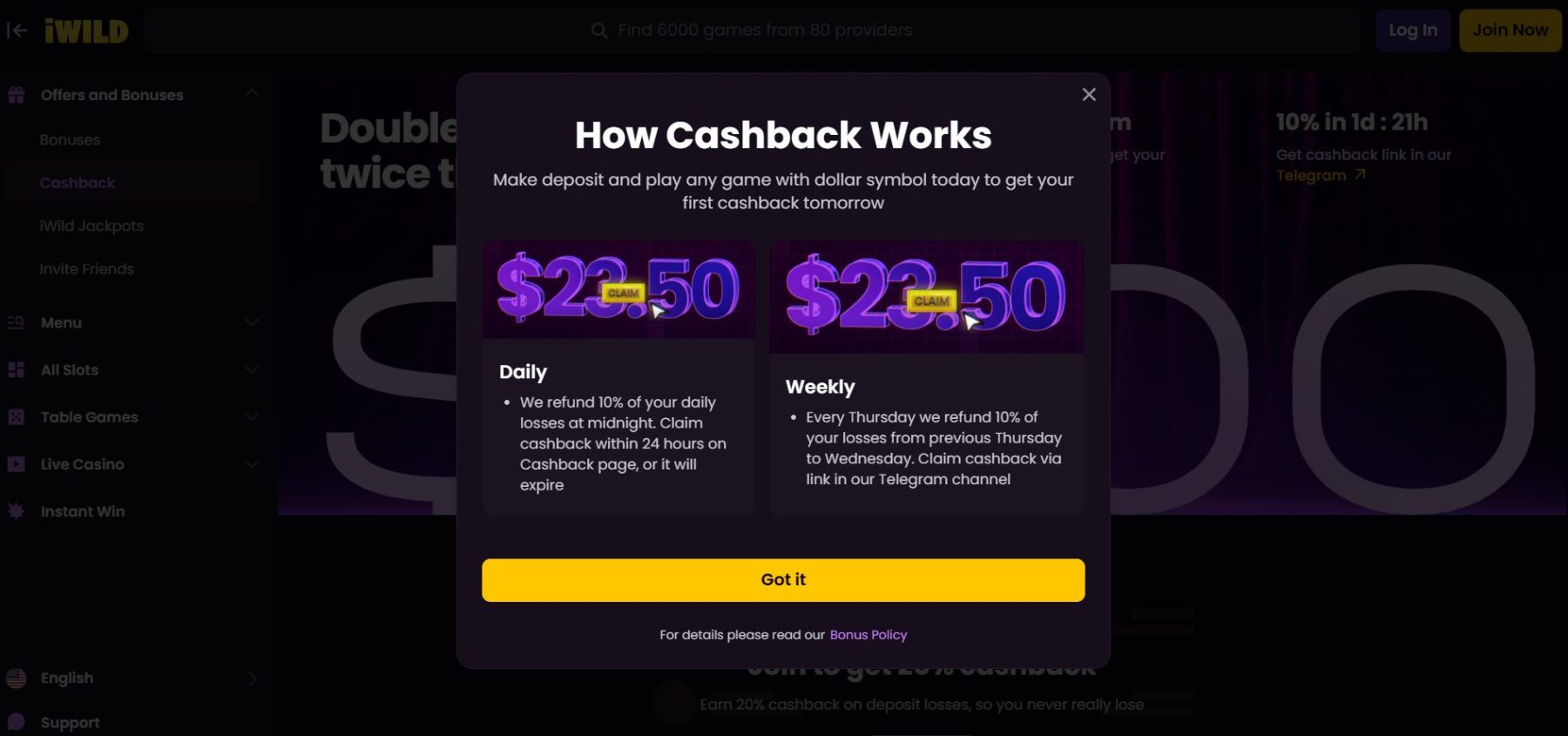Taip pat kartą per savaitę „iWild“ grąžina 10 % nuostolių, patirtų nuo praėjusio ketvirtadienio iki trečiadienio. Ši grąža suteikiama per kazino „Telegram“ platformą.