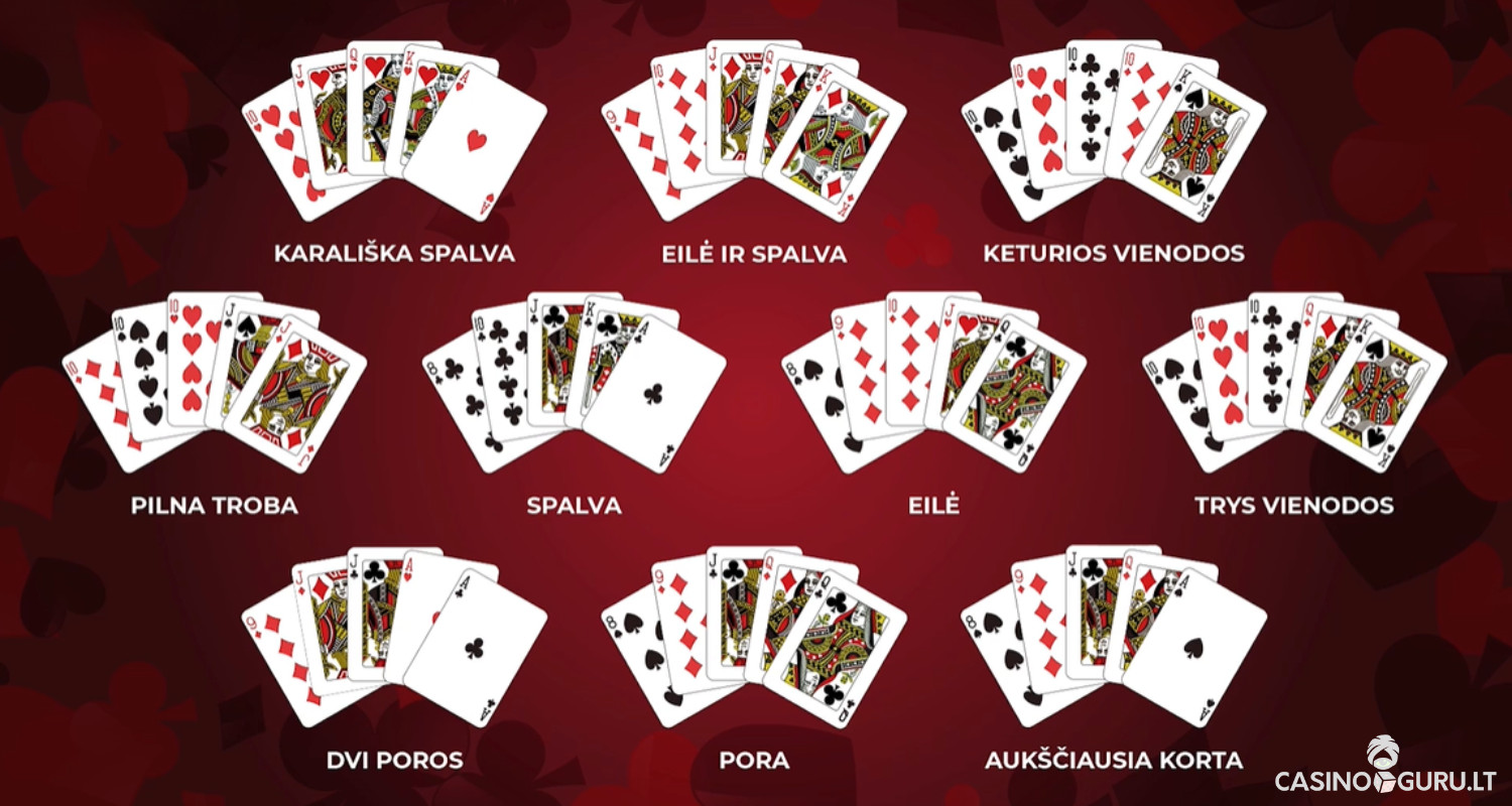 Laiminčių kombinacijų sąrašą užbaigia trys vienodos, dvi poros, viena pora ir aukščiausia korta.