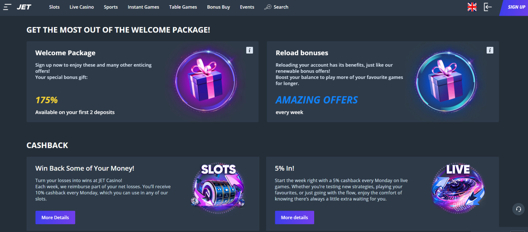 „Jet“ kazino siūlo pasveikinimo paketą pirmiesiems dviem įnašams, papildymo premijas ir savaitinį pinigų grąžinimo pasiūlymą lošimo automatų ir gyvojo kazino žaidėjams.