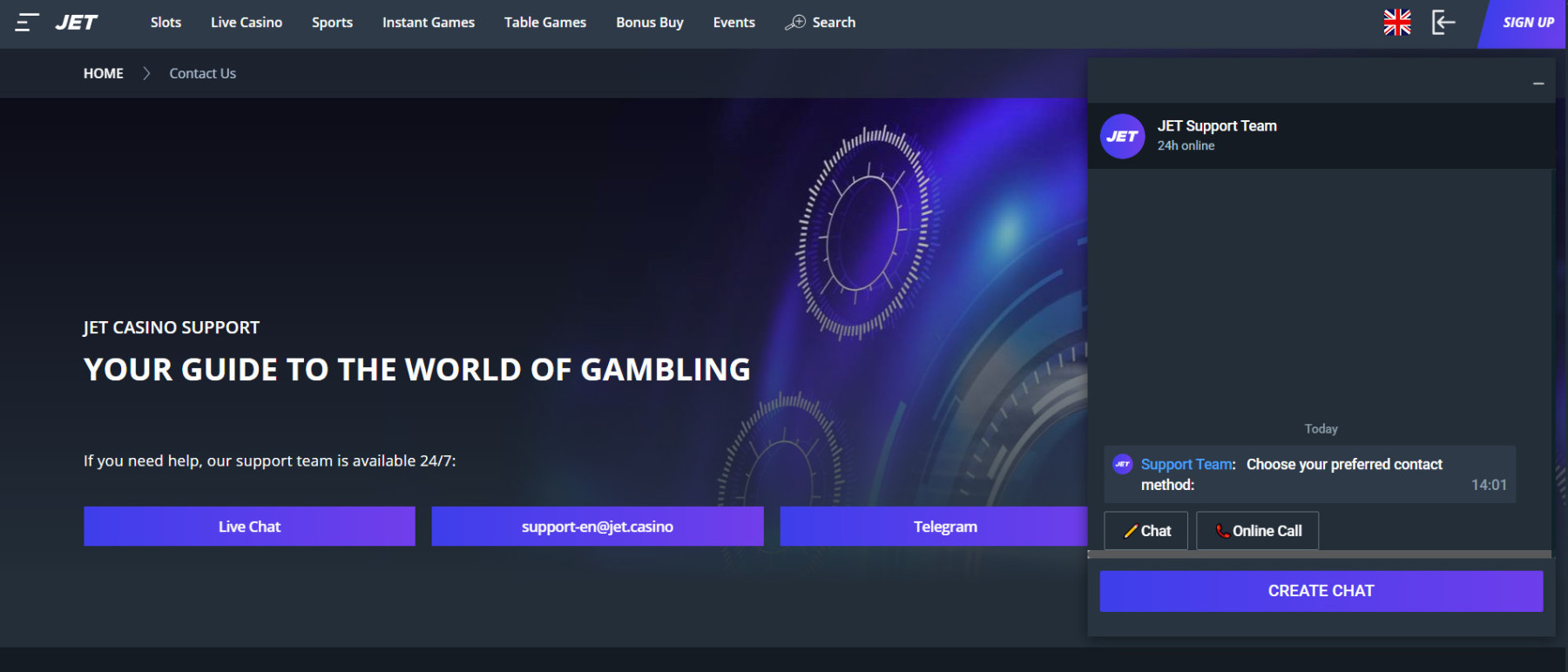 „Jet Casino“ klientų aptarnavimo komanda dirba 24/7. Su jais galite susisiekti per tiesioginį pokalbį, „Telegram“ arba el. paštu: [email protected].
