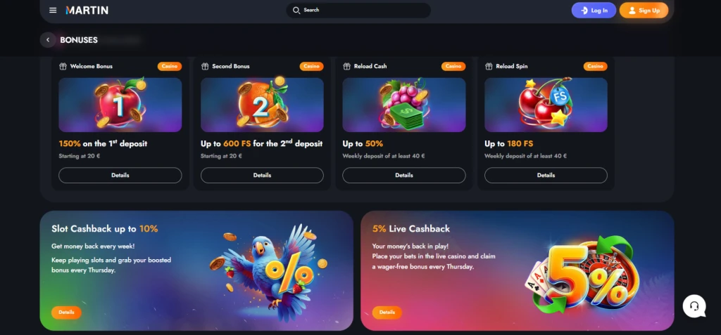 „Martin“ kazino premijų sistema atrodo apgalvota – dosni, aiškiai struktūruota ir lengvai suprantama. Skirtingai nei daugelis kitų kazino platformų su painiais ir pertekliniais pasiūlymais, „Martin“ išlaiko paprastumą – du aiškūs pasveikinimo bonusai, kurie iš tiesų suteikia vertės žaidėjams.