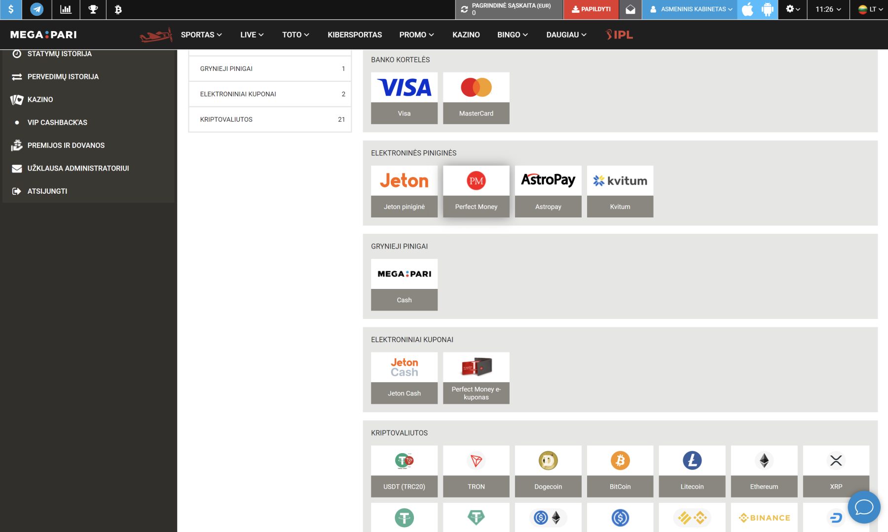 - Lotto – čia turite galimybę nusipirkti bilietus į tokias loterijas, kaip PowerBall, Mega Millions, Super Lotto, Euro Millions, Euro Jackpot, GosLoto, Megalot ir Fantasy5.