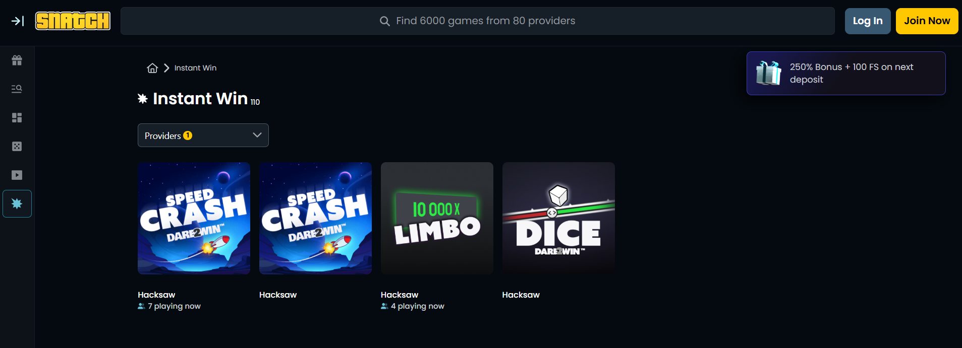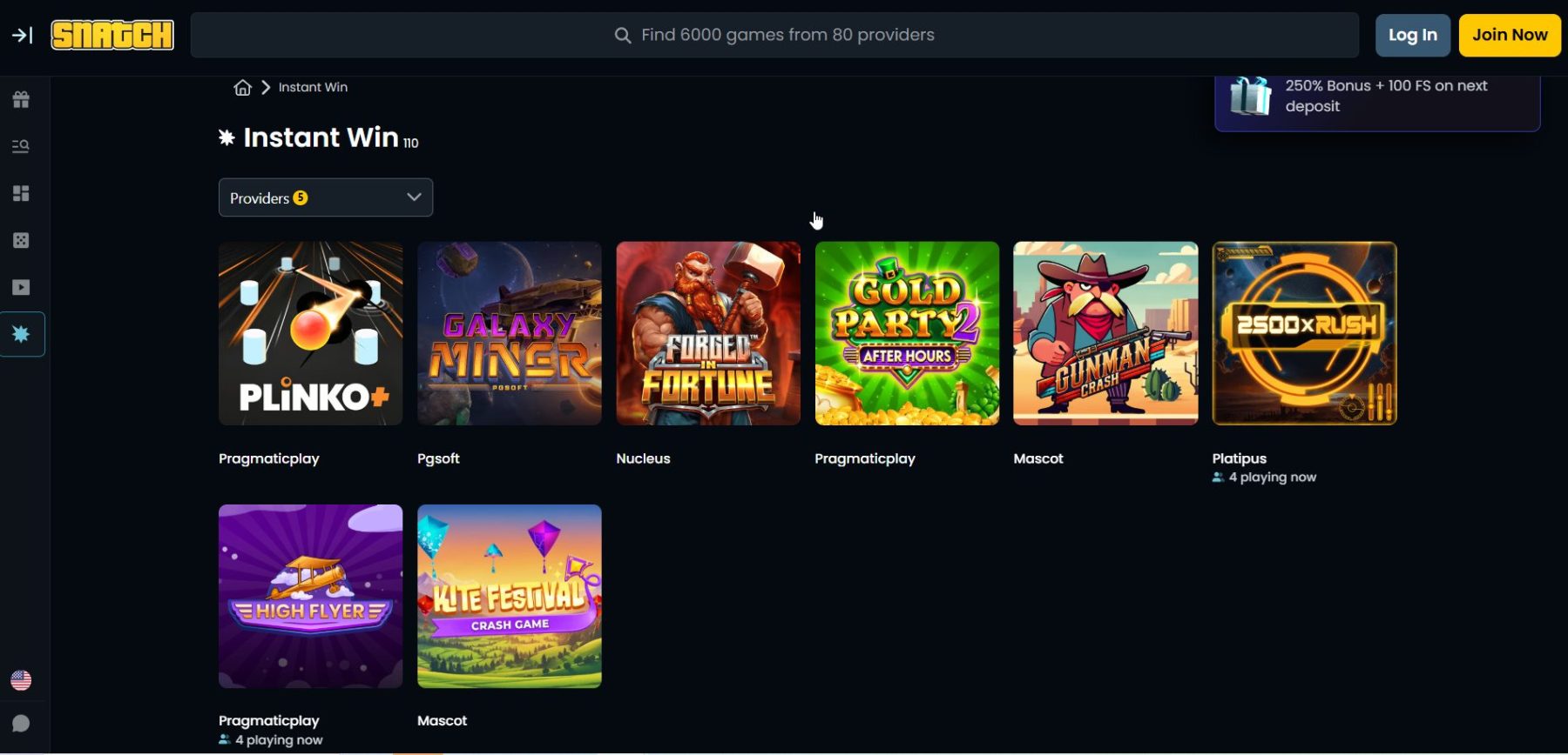 „Snatch“ kazino rasite ne tik įprastus lošimo automatus, kuriuos tikrai verta išbandyti. Čia siūlomi ir momentiniai žaidimai – „Crash“, „Plinko“, „Mines“, „Dice“ bei kiti variantai, veikiantys skirtingai nei įprasti lošimo automatai.