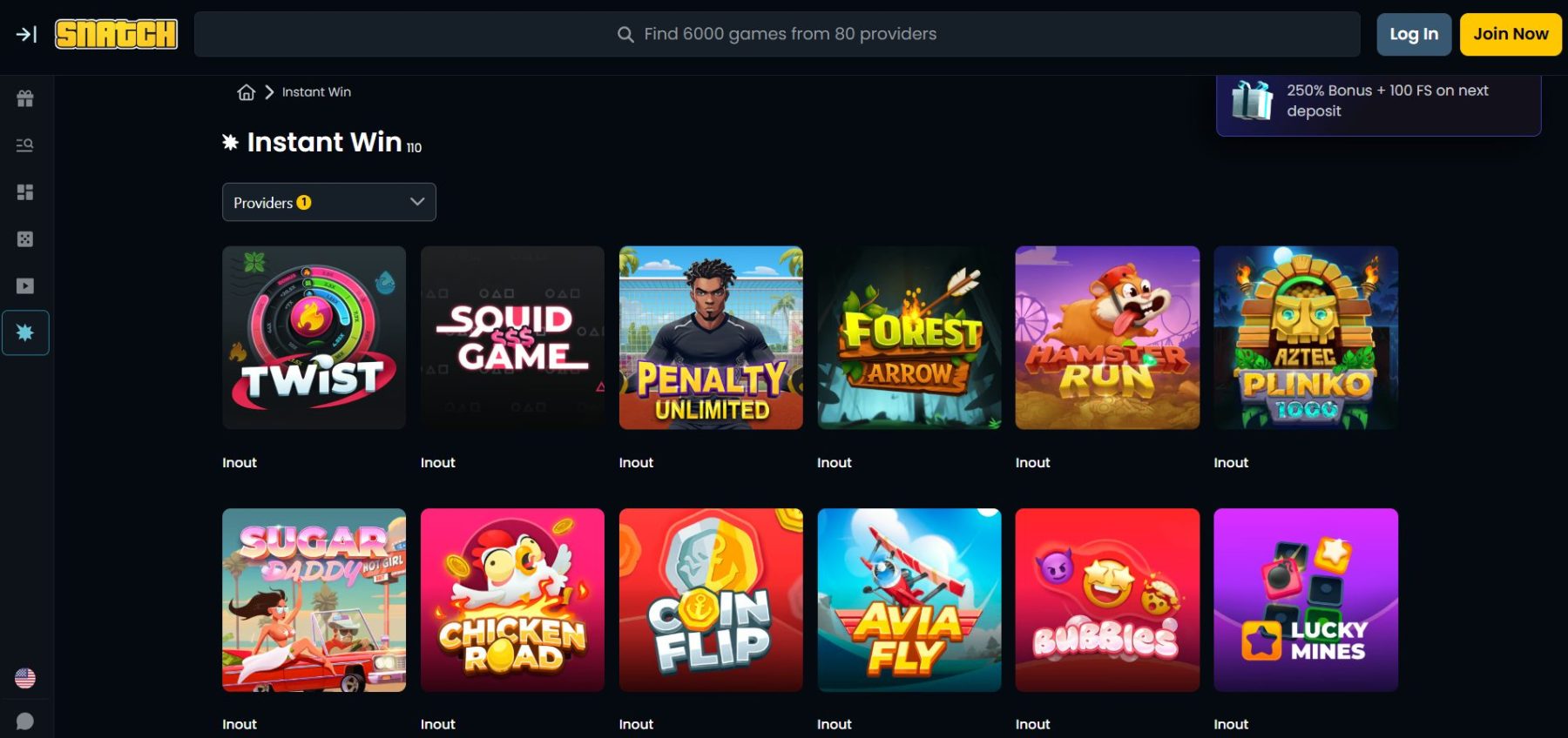 „Inout“ siūlo įvairių arkadinių žaidimų – nuo „Plinko“ ar „Mines“ iki „Crash“ ir monetos metimo, kurių „Snatch“ kazino yra per 30. Jie greiti, vizualiai patrauklūs ir lengvai perprantami.