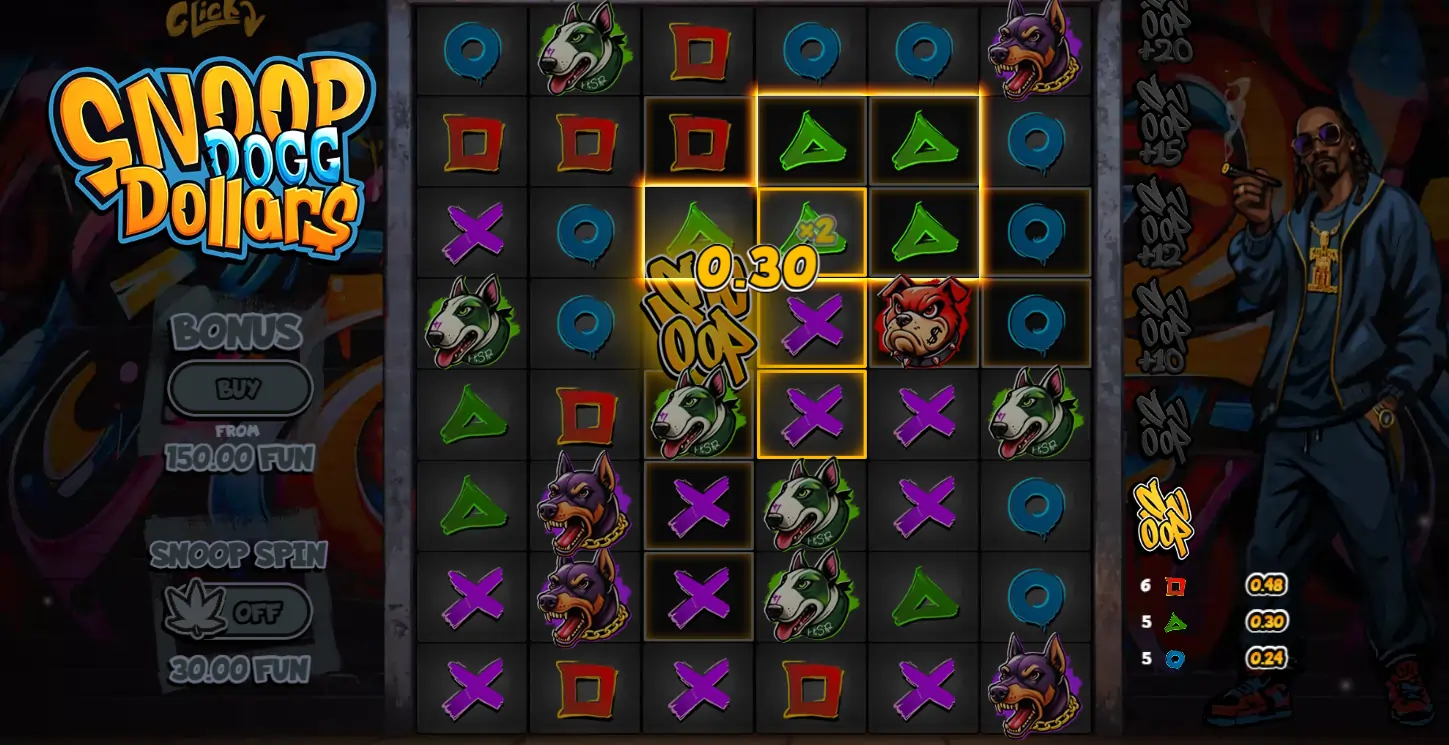 „Snoop Dogg Dollars“ išsiskiria ryškiomis spalvomis ir nuotaikinga muzika. „Wild“ simboliai gali išsiplėsti per visą ekraną, o daugikliai pasirodo netikėtai. Nemokamų sukimų metu ritės nusidažo auksine spalva, o laimėjimų galimybės tampa itin dosnios.