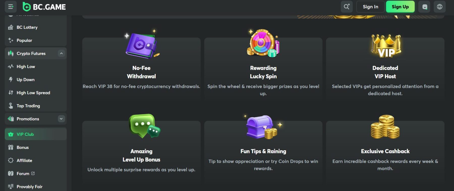 „BC.Game“ sukūrė kiekvienam žaidėjui prieinamą VIP sistemą. Joje – daugiau nei 140 lygių, o naudos pradedamos gauti jau nuo pirmojo statymo. Už kiekvieną kazino žaidimuose pastatytą eurą suteikiami patirties taškai, kurie ilgainiui atrakina vis naujas privilegijas.