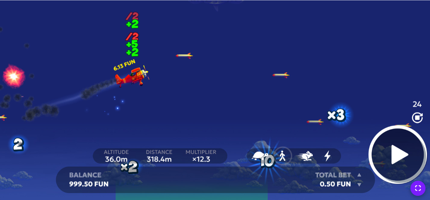 | Mechanikos | Skrydžio metu atsirandantys atsitiktiniai daugikliai, „Big“, „Mega“ ir „Super Mega Win“ lygiai, automatinis ir rankinis „cash out“ |