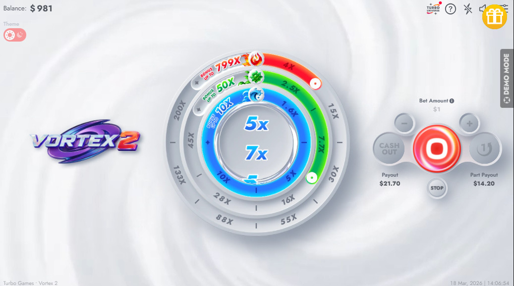 „Vortex 2“ žaidime rasite didėjantį daugiklį su papildomais specialiais žaidimo elementais, kurie suteikia daugiau dinamikos nei įprasti momentiniai žaidimai. Maksimalus daugiklis čia gali siekti net 999 x, o žaidimo eiga pritaikyta tiek mobiliesiems įrenginiams, tiek kompiuteriams.