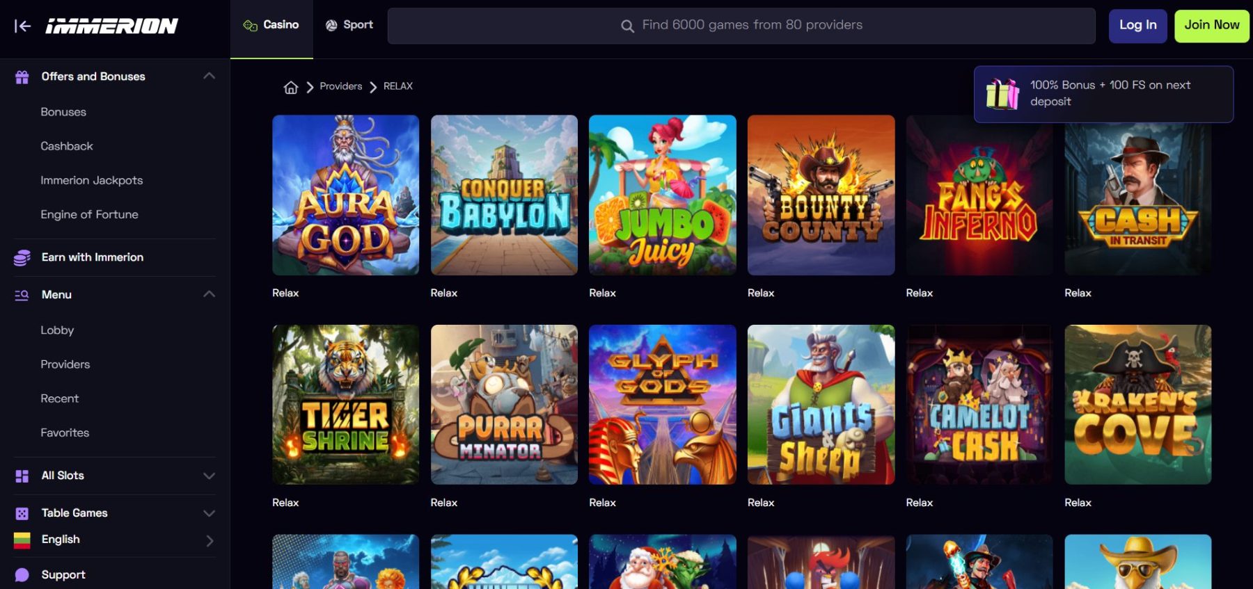 „Immerion Casino” suteikia prieigą prie 140 „Relax Gaming” lošimo automatų, kuriuos galite pasiekti filtruodami žaidimus pagal žaidimų tiekėją. Be to, „Immerion” leidžia išbandyti žaidimus demonstracine versija net lankytojams, todėl „Relax Gaming” žaidimais galite mėgautis nemokamai.