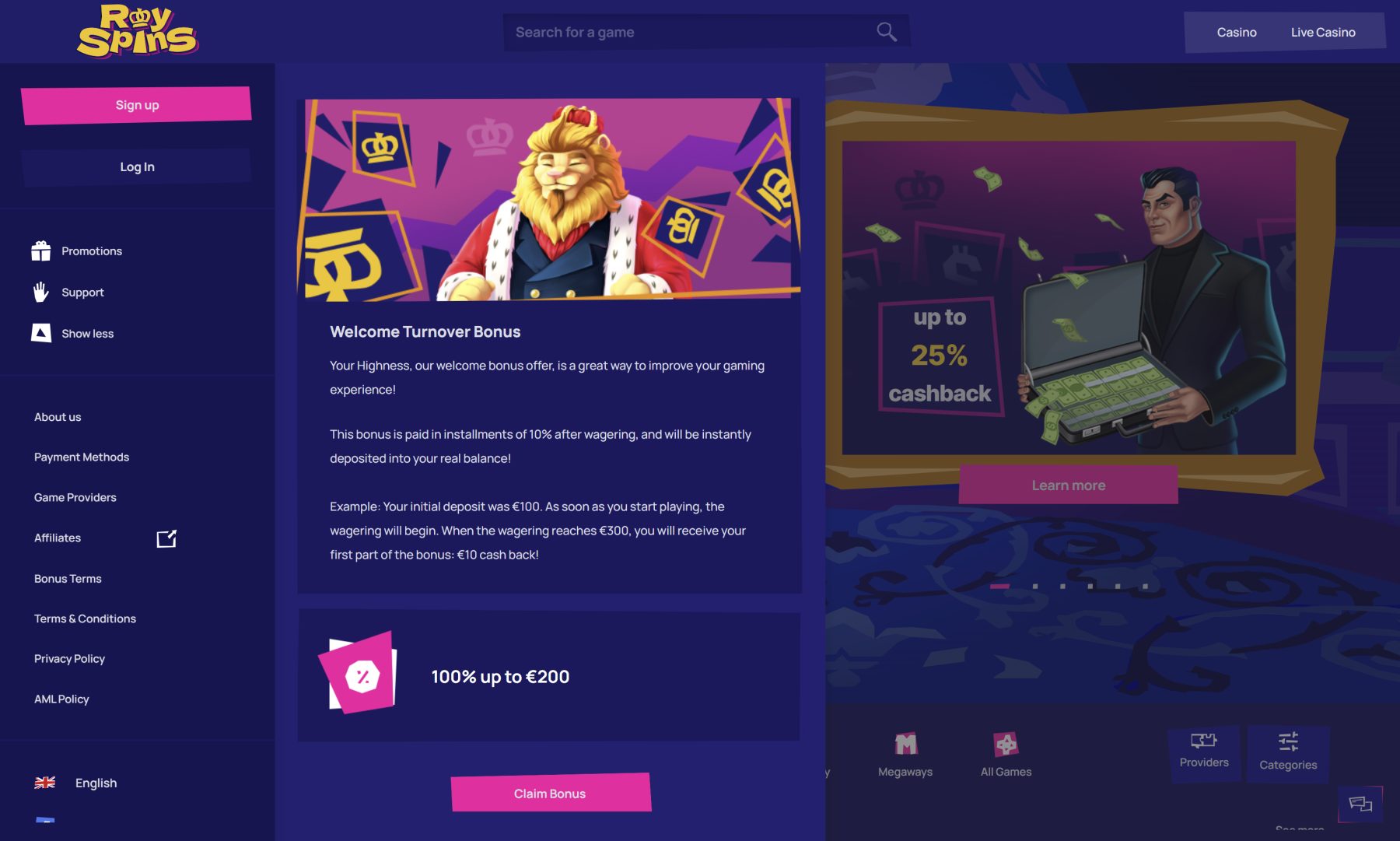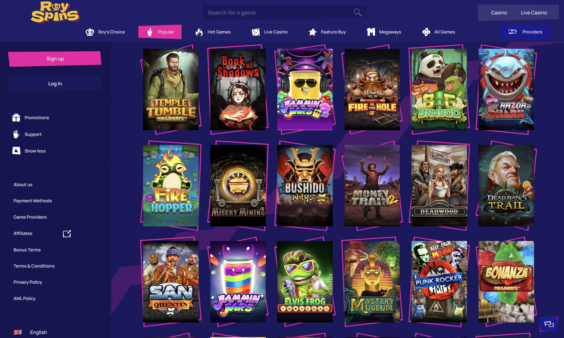 Puslapio viršuje matomos tokios kategorijos, kaip “Roy’s Choice”, Popular, Hot Games, Feature Buy ir Megaways. Labai džiugu, kad šis kazino išskiria žaidimus, kuriuose galima nusipirkti premiją, todėl, jeigu mėgstate tai daryti, RoySpins tai daryti bus itin patogu.