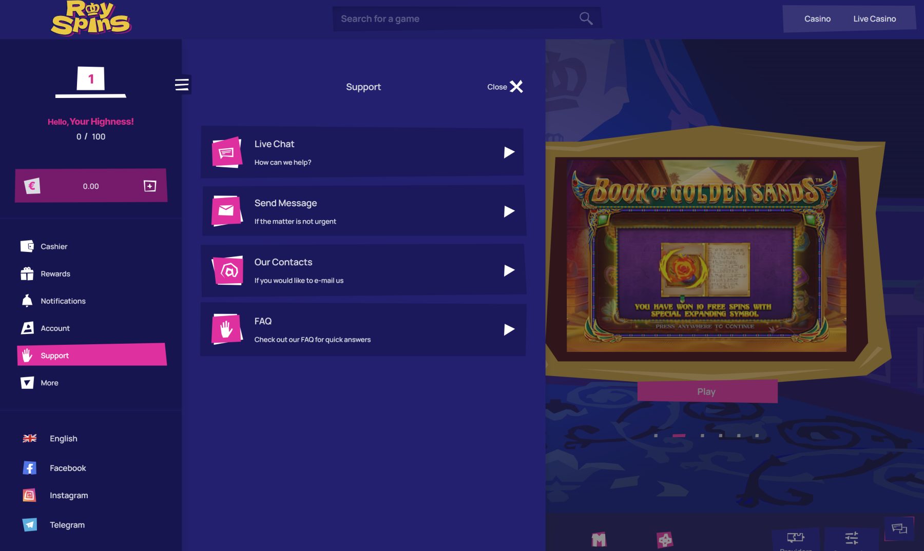 Iškilus problemai galėsite susisiekti su RoySpins klientų aptarnavimo centru tiesioginio pokalbio pagalba, kuris veikia 24/7. O taip pat, yra galimybė su šio kazino atstovais susisiekti ir el. paštu.