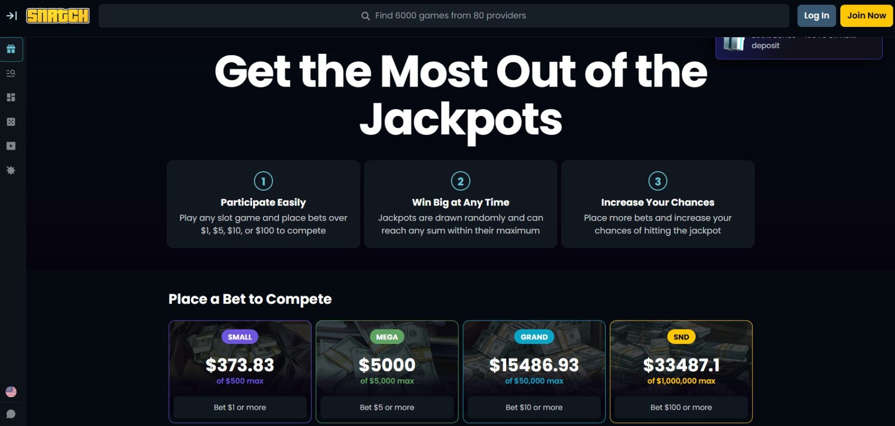 „Snatch“ kazino siūlo unikalią jackpotų sistemą, kurioje kiekvienas turi šansą laimėti dėmesio vertus prizus – statant tiek dideles, tiek ir mažesnes suma. Čia veikia net keturi skirtingi jackpotų lygiai, o dalyvauti paprasta kaip niekad – tereikia žaisti mėgstamais lošimo automatais.