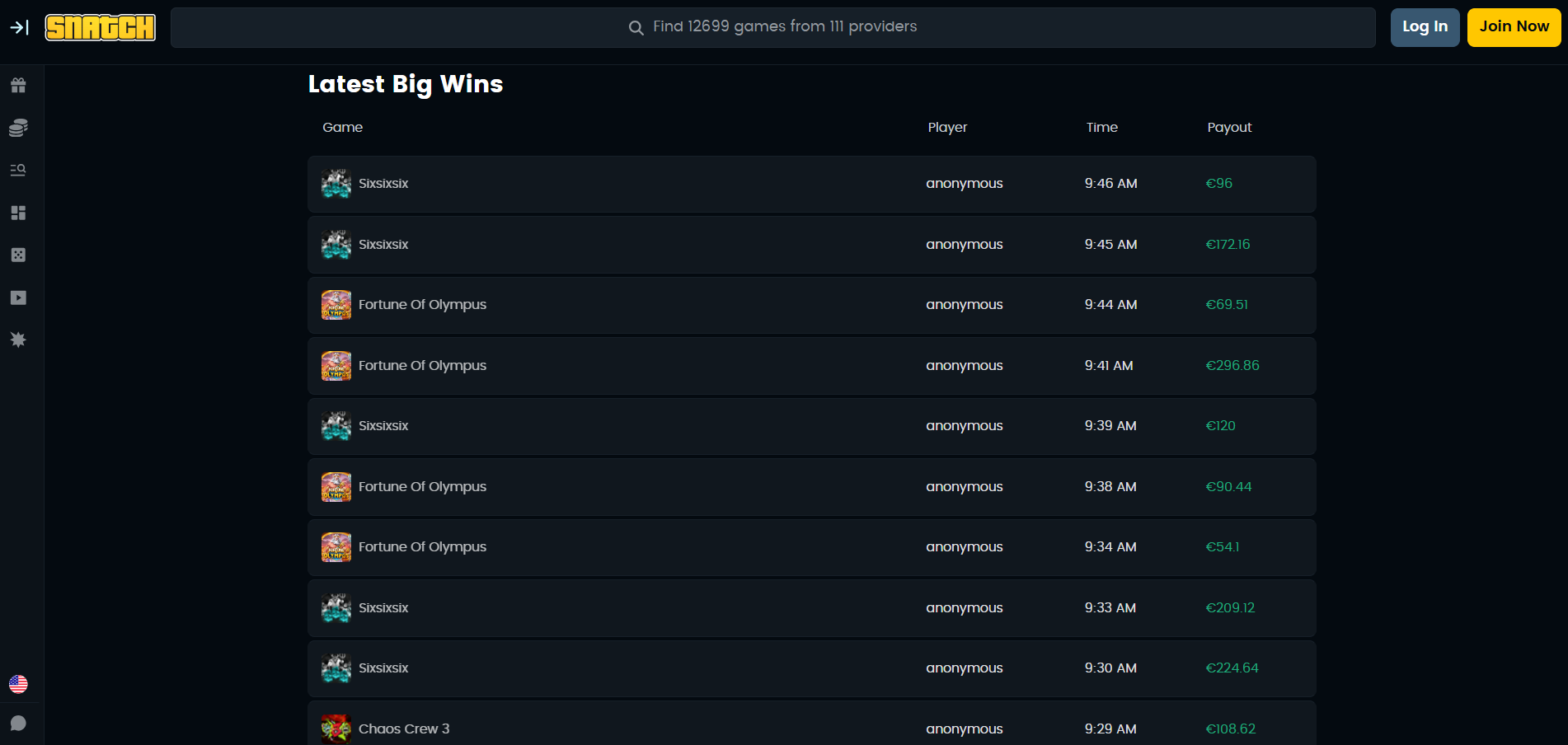 Žaidėjų laimėjimai gana aiškiai parodo, kiek aktyvi yra pati platforma. „Snatch“ šiuo atžvilgiu palieka gerą įspūdį – naujausi rezultatai pateikiami realiu laiku, todėl gali matyti, kiek tuo metu laimi kiti žaidėjai, o veiksmas čia vyksta nuolat.