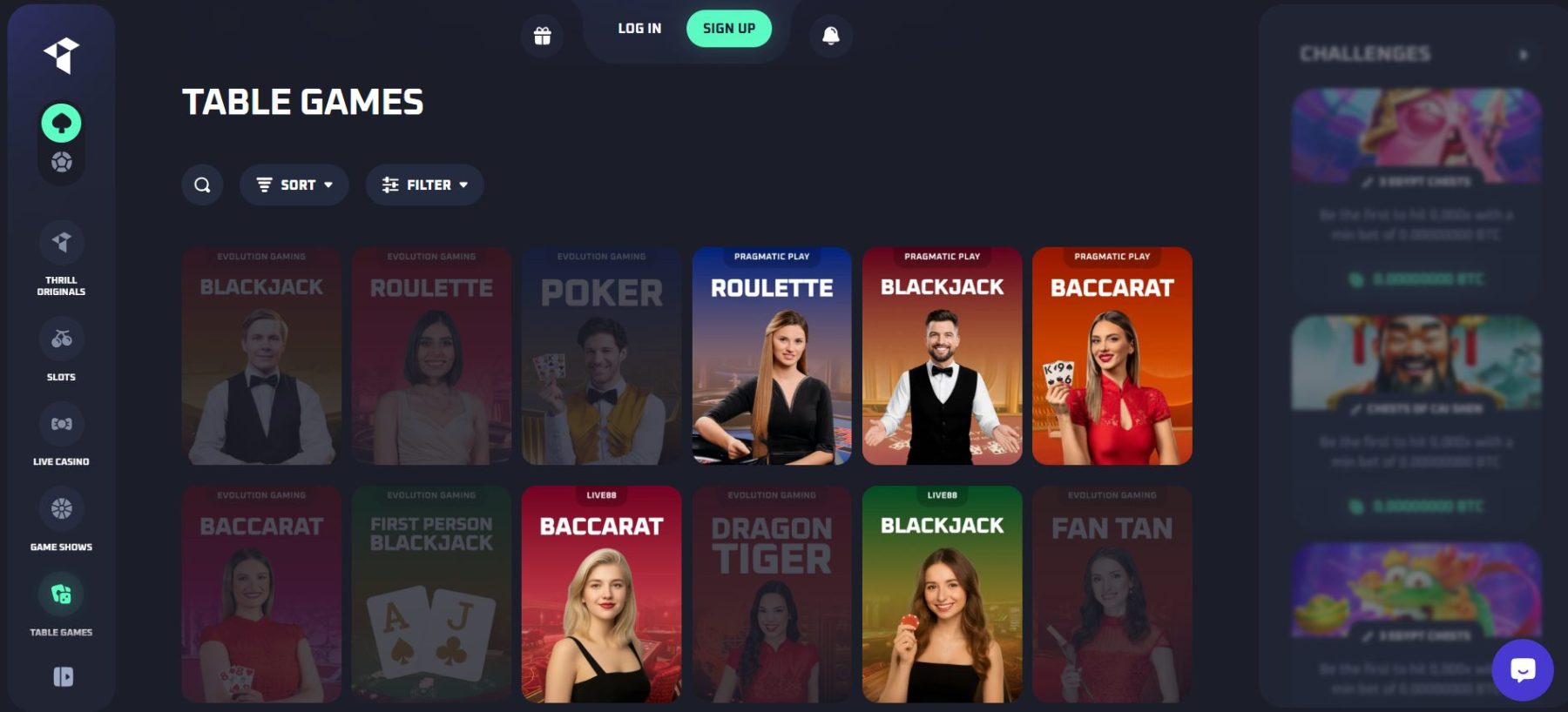 „Thrill“ kazino siūlo įvairius stalo žaidimus – nuo klasikos iki šiuolaikinių jos interpretacijų, kurios pritaikytos skirtingiems žaidėjų stiliams. Jūsų laukia „Blackjack“, ruletė, pokeris, bakaratas, „Sic Bo“ ir „Teen Patti“.