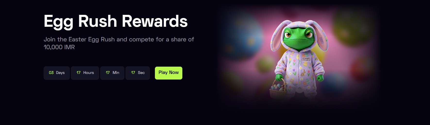 „Immerion“ kazino siūlo velykinę turnyro tipo akciją, kuri laužo standartus: čia jūsų laukia net 10 000 IMR prizinis fondas ir lengvai suprantamos taisyklės. Tiesiog junkitės prie „Egg Rush“, žaiskite ir surinkite visas pergales!