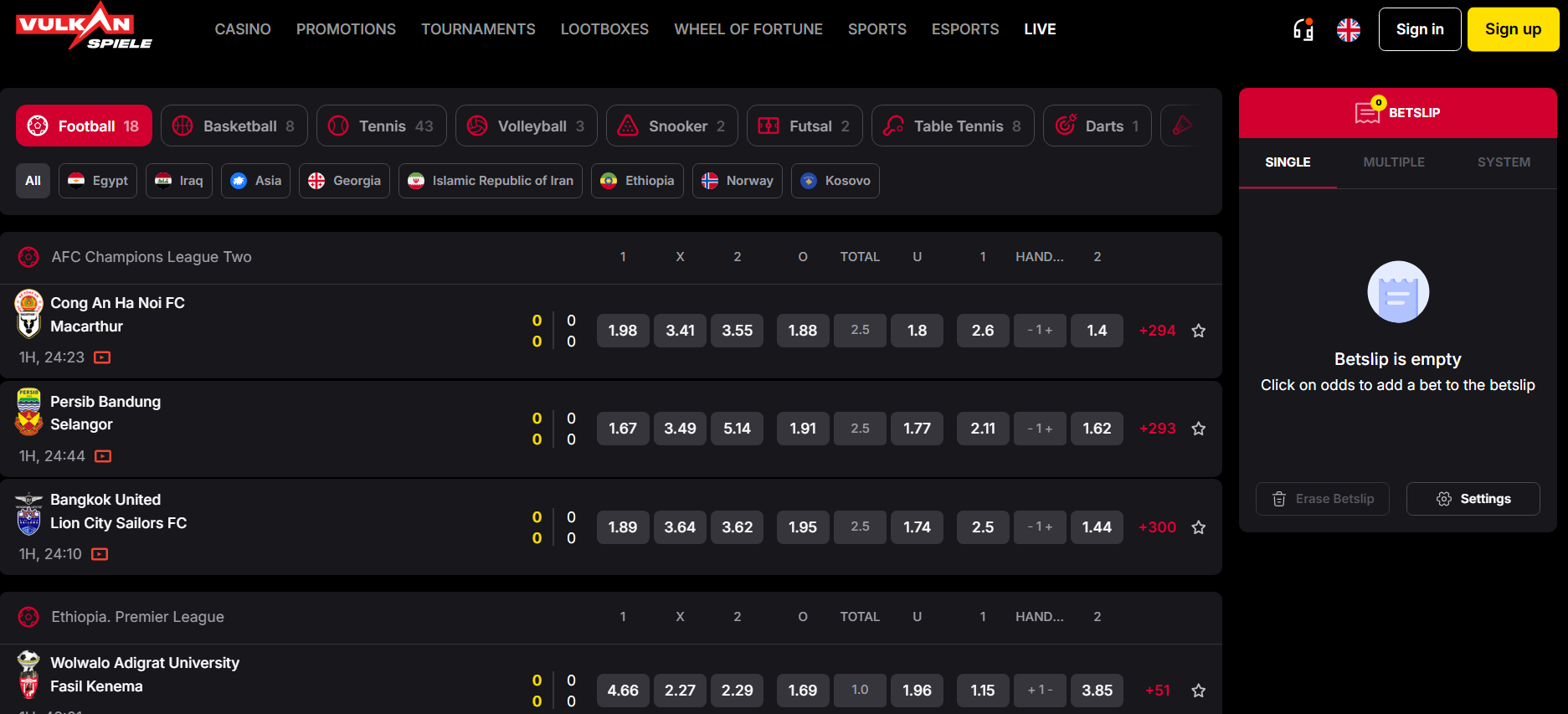 Futbolui „VulkanSpiele“ skiria itin daug dėmesio – be pagrindinių lygų, tokių kaip Premier League, Champions League, La Liga, Serie A ar Bundesliga, čia rasite ir kitus tarptautinius turnyrus.