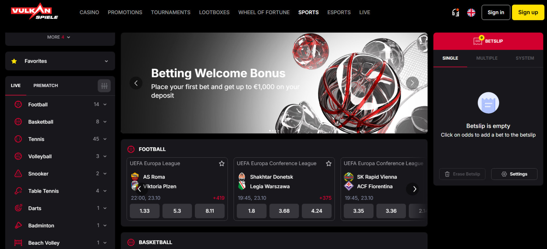„VulkanSpiele“ siūlo daugybę sporto ir e-sporto rungtynių, nuo plačiai žinomų tarptautinių lygų iki mažiau reikšmingų varžybų. Tuo tarpu patogus išdėstymas leidžia greitai rasti tai, kas domina.