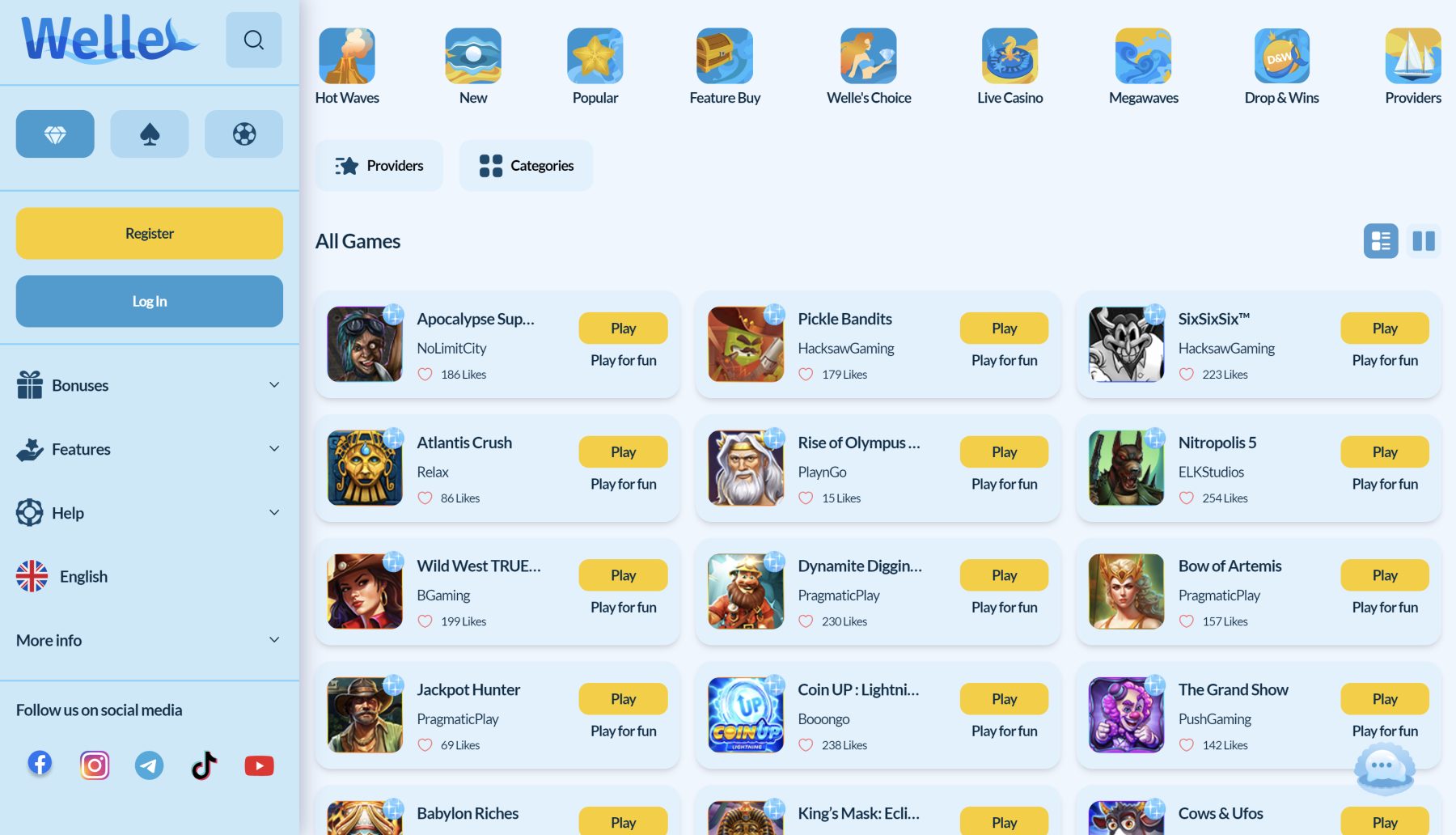 Kalbant apie tiekėjus, Welle galėsite mėgautis lošimo automatais iš NoLimit, Hacksaw, PlaynGo, ELK, Pragmatic, Relax ir daugybės kitų. Galite būti tikri, kad čia rasite pačius populiariausius ir naujausius žaidimus.