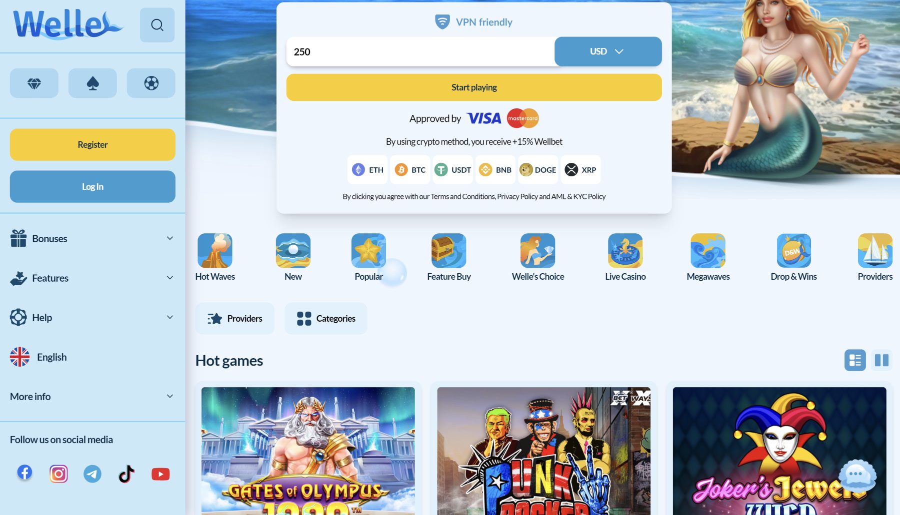 Šiame kazino rasite virš 5000 įvairiausių žaidimų. Labai svarbu paminėti, kad Welle leidžia naudoti VPN, todėl galėsite mėgautis visais žaidimais.