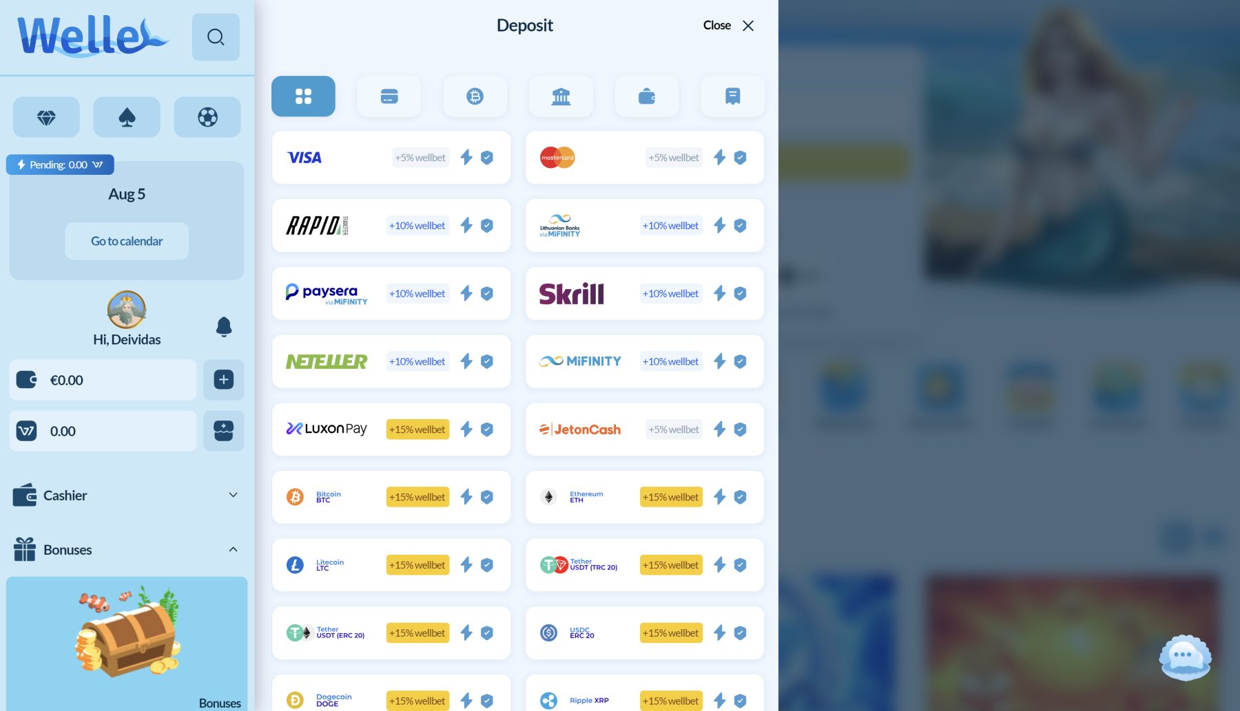Toli gražu ne visi užsienietiški kazino suteikia galimybę patogiai atlikti mokėjimus. Džiugu, kad Welle yra maloni išimtis ir žaidėjams siūlo atlikti mokėjimus SEB, Luminor bei Revolut bankų kortelėmis. Swedbank šiuo metu neveikia, tačiau tokiu atveju galite pamėginti atlikti bankinį pavedimą.