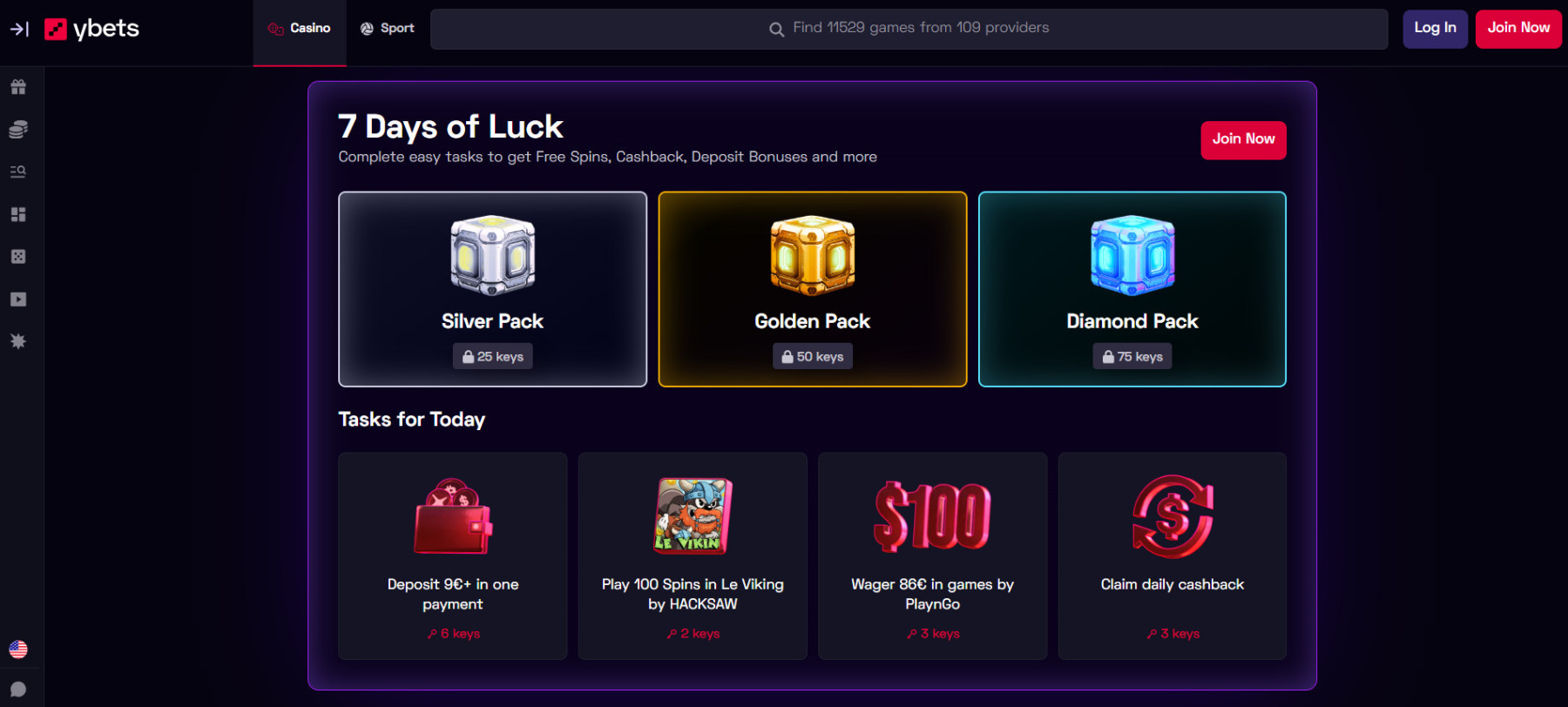 „Ybets“ kazino išsiskiria tuo, kad siūlo vieną dosniausių pasveikinimo paketų, apimantį net keturis pirmuosius sąskaitos papildymus. Pradėjus nuo vos 9 € įmokos, ją galima gerokai padidinti, o bendra premijų suma gali siekti net 869 €.