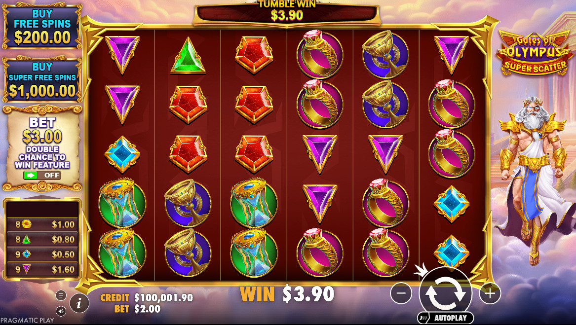Nepaisant sudėtingai skambančio funkcijų paaiškinimo, „Gates of Olympus Super Scatter“ veikia kaip įprastas lošimo automatas. Užtenka nustatyti statymo dydį ir paspausti mygtuką „Sukti“, kad galėtumėte mėgautis žaidimu.