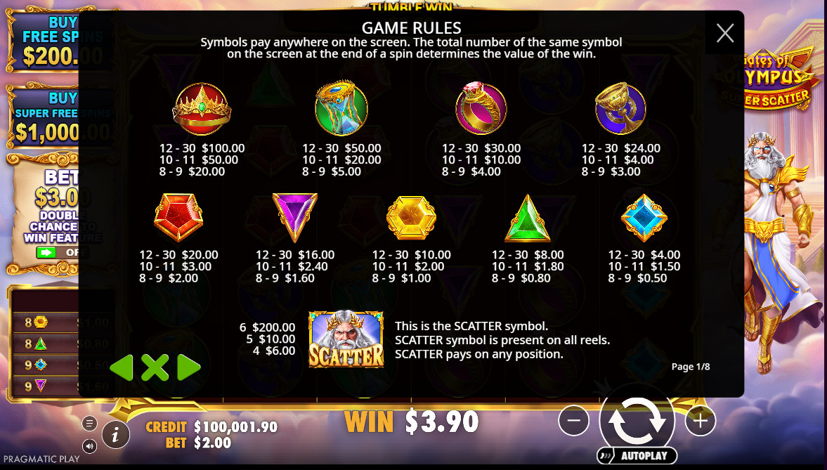 „Gates of Olympus Super Scatter“ turi populiarią ir mėgstamą „Tumble Reels“ funkciją. Jame nėra besisukančių būgnų, o simboliai krenta iš ekrano viršaus. Kai tik susidaro laimintis derinys, šie simboliai sprogsta ir sukuria vietos naujiems krentantiems simboliams. Kiekvieno sukimo metu galima gauti kelis laimėjimus, ir tai nuostabu.