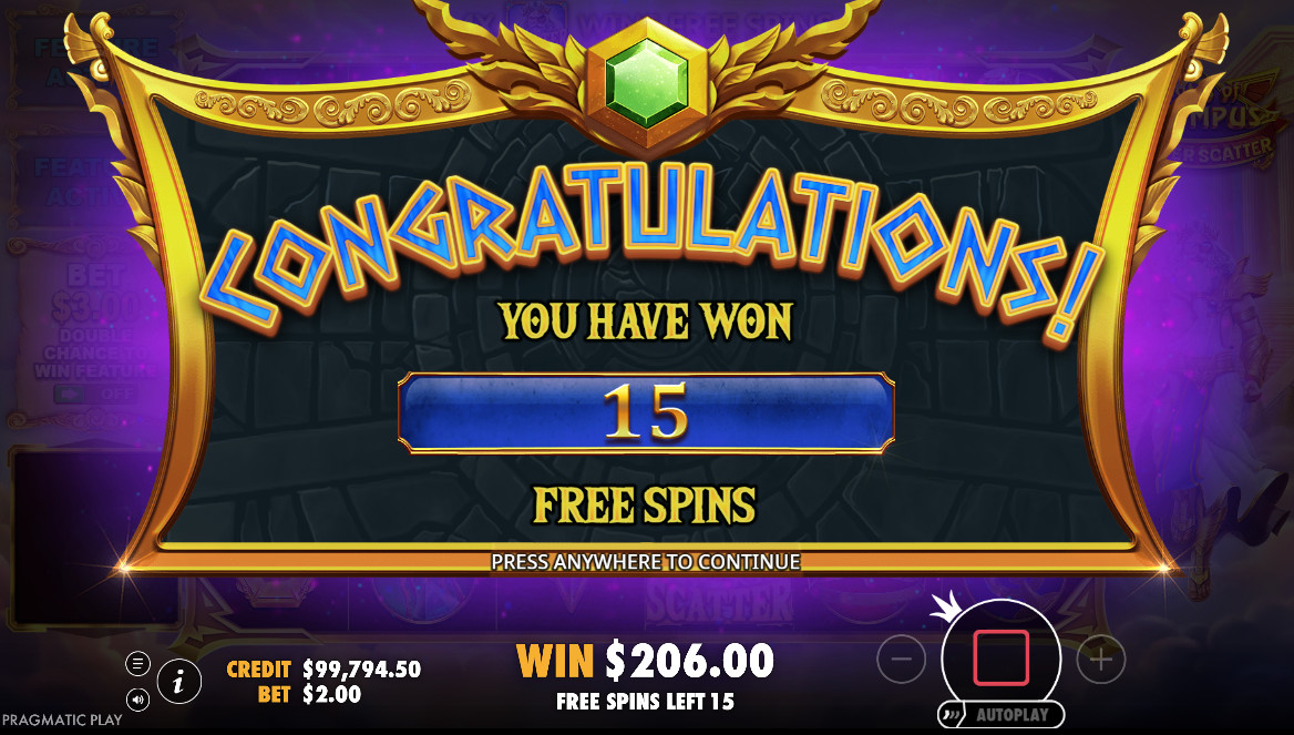 „Mighty Zeus“ yra standartinis „Scatter“ simbolis, kuris išmoka laimėjimą bet kurioje pozicijoje, jei sutampa 4, 5 arba 6 simboliai. Išmokos yra 3x, 5x ir 100x. Dar svarbiau, kad bent 4 „Scatter“ simboliai suaktyvina 15 nemokamų sukimų. „Pragmatic Play“ dar labiau pagerino situaciją, leisdama nemokamus sukimus pakartotinai suaktyvinti, kai būgnuose pasirodo trys ar daugiau „Scatter“ simbolių.