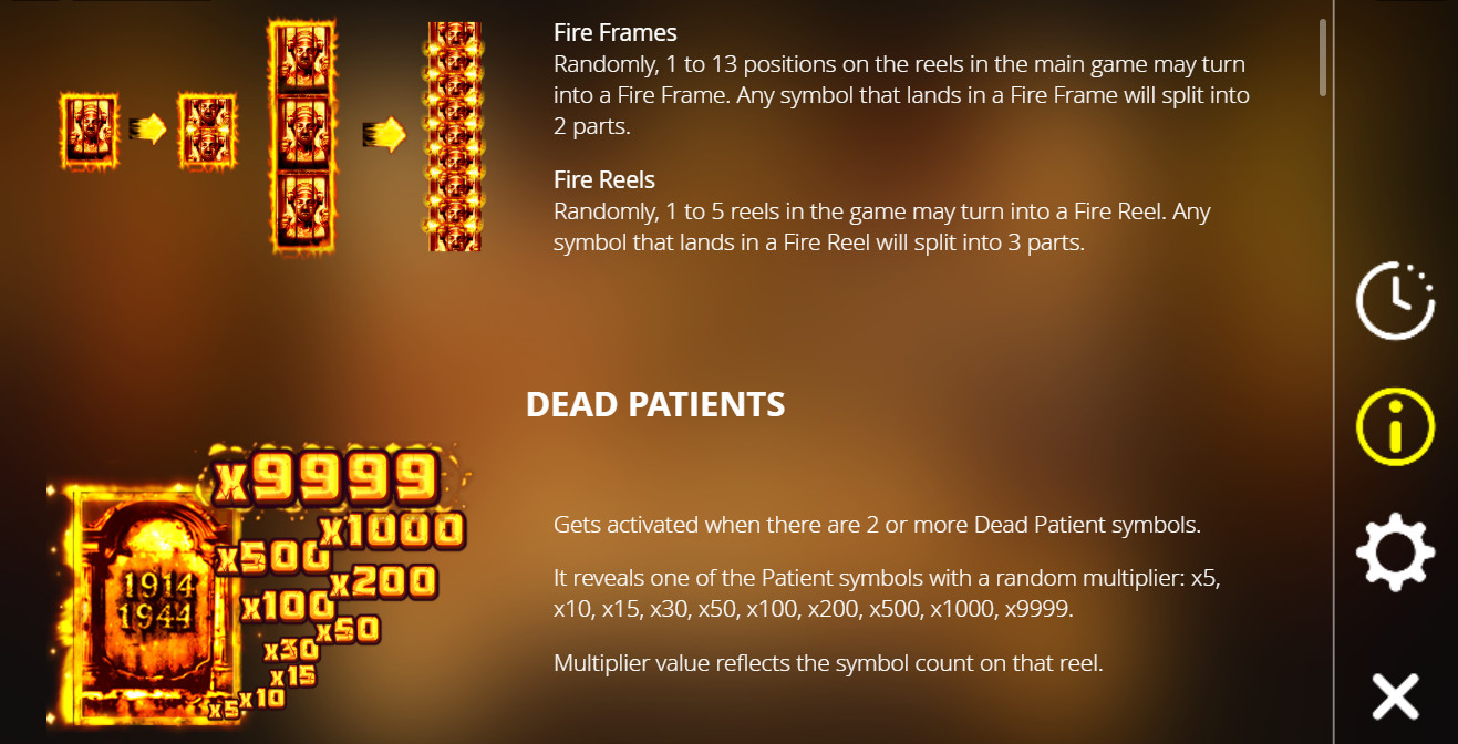 | „Enhancer Cells“ | Atsidaro po 2–4 būgnais, kai pasirodo „Fire Frames“; gali suteikti „Wild“, daugiklius (iki x9 999), „xWays“, „xSplit“ ar „Dead Patients“ | Prideda galingų modifikatorių |